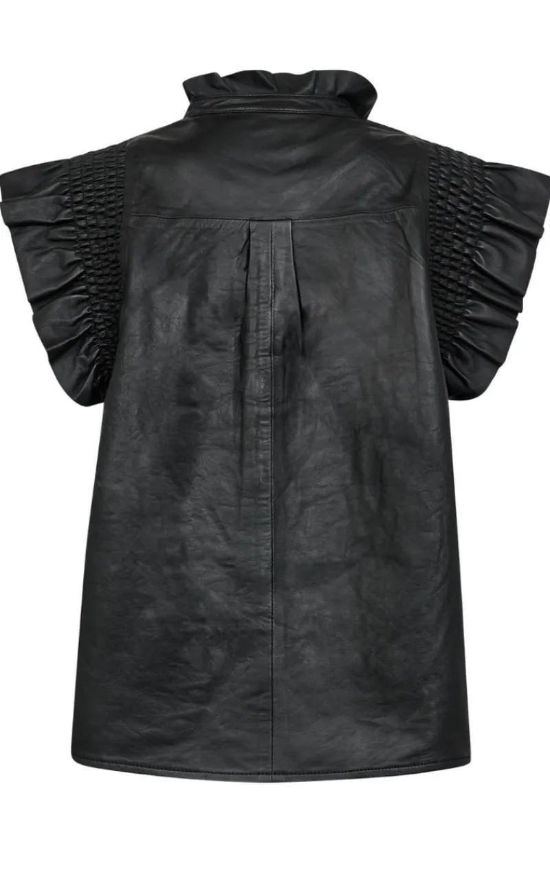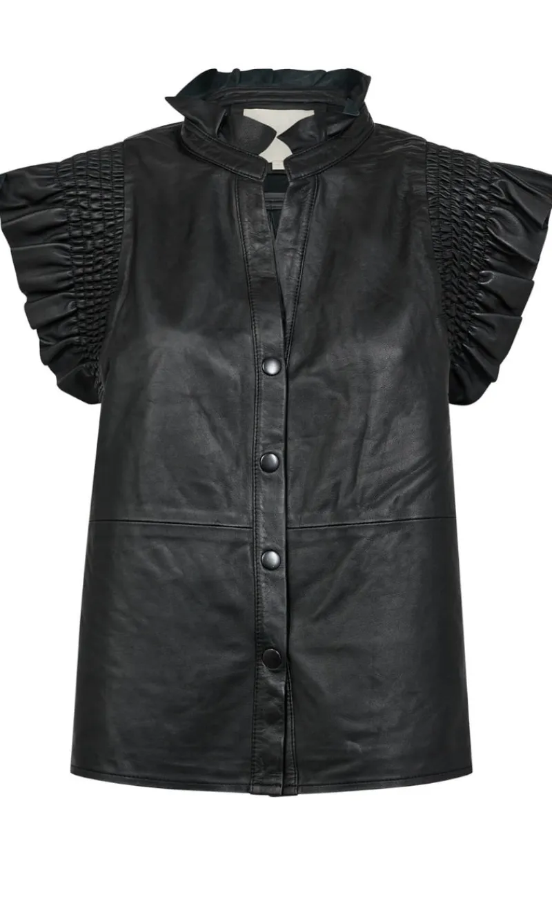 Den har flæsedetaljer ved ærmerne samt er gennemknappet.