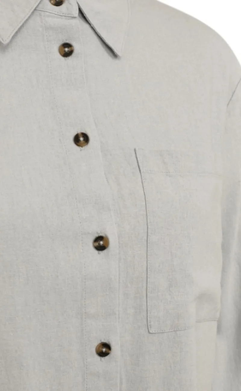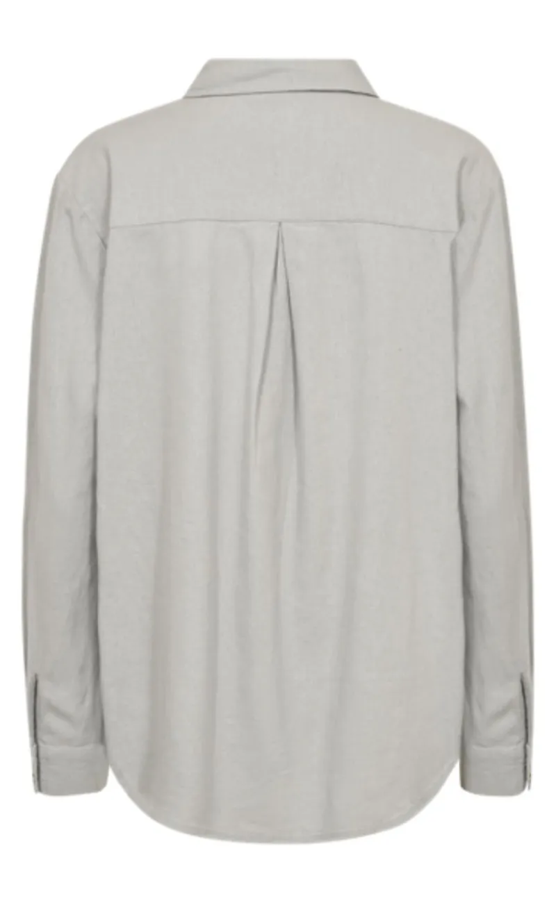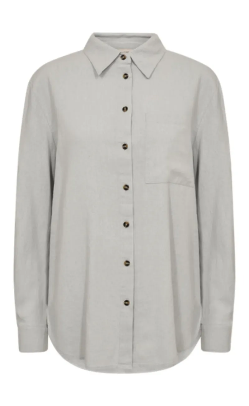 Skjorten har lange ærmer, er gennemknappet, en klassisk skjortekrave samt én brystlomme.