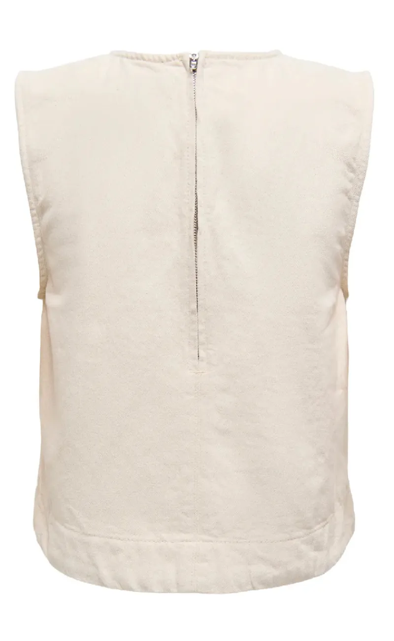 Toppen er ærmeløs og lukkes i nakken med lynlås.