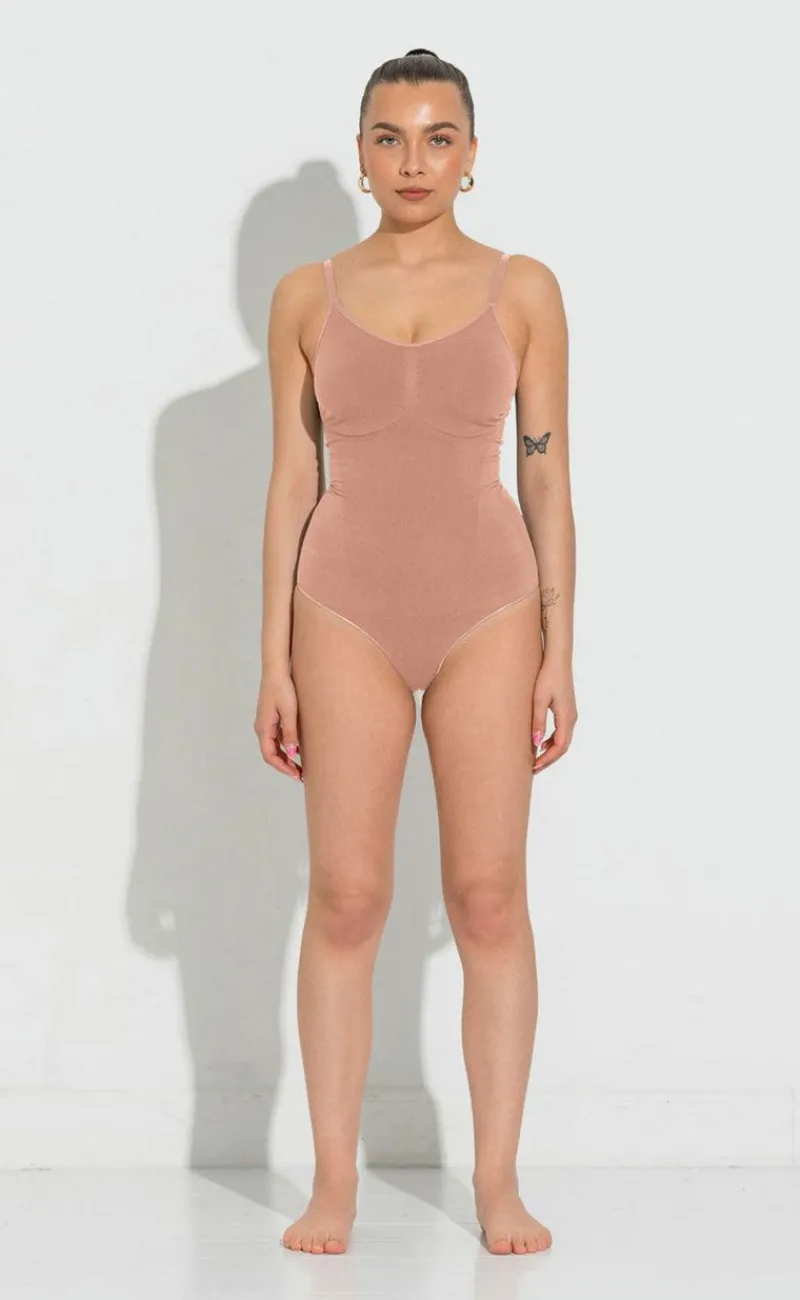 Bodystocking fra Lykkeland Ateliér i en beige farve.