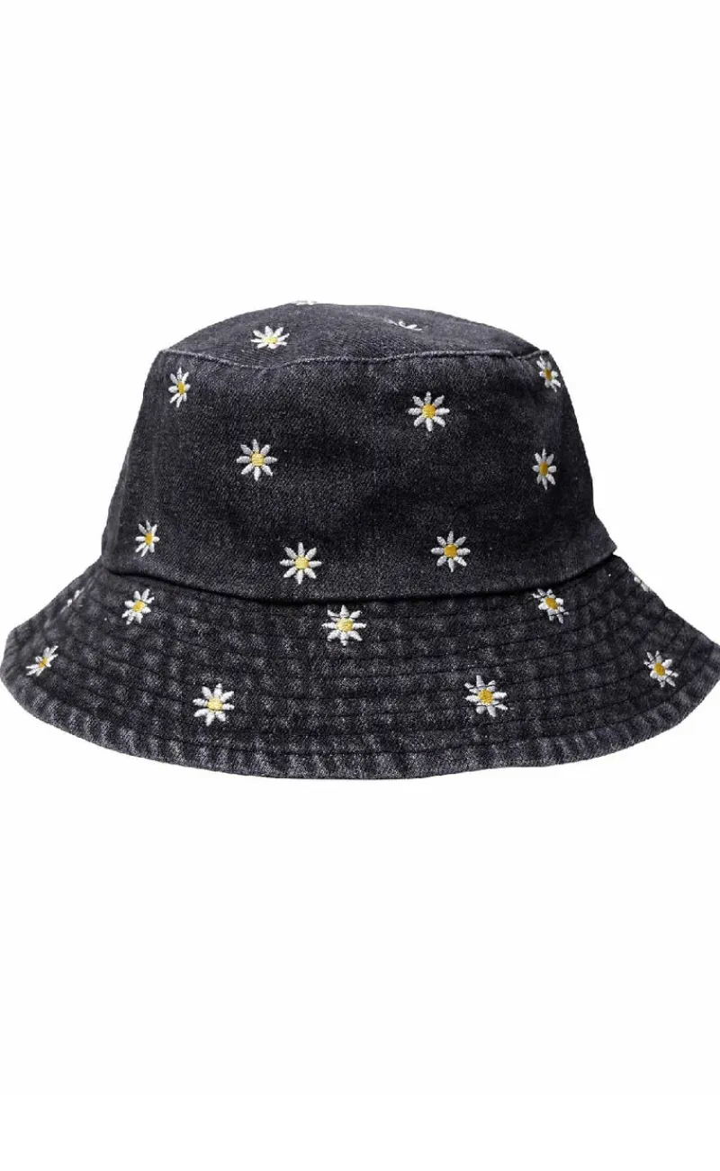 Lækker bøllehat fra Black Colour i en denim kvalitet, med broderede margueritter.