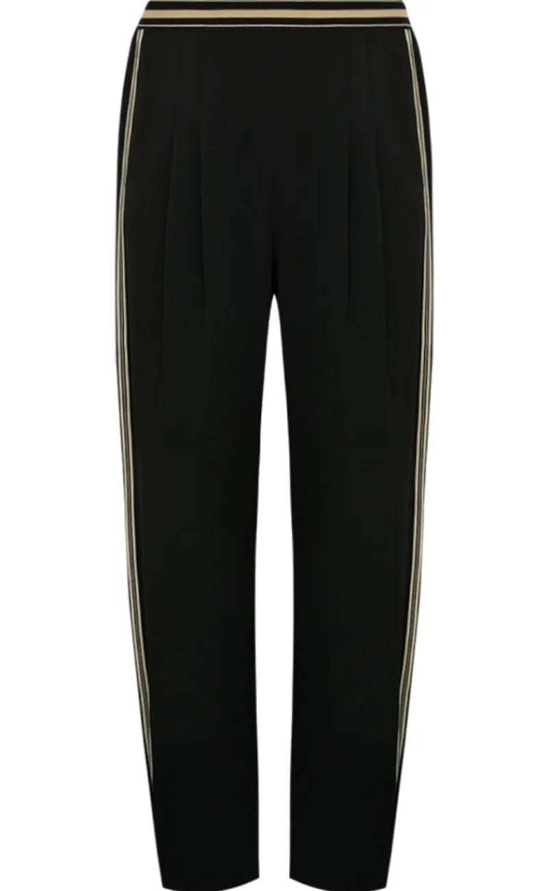 Bukserne har elastik i taljen med en stribet kant.