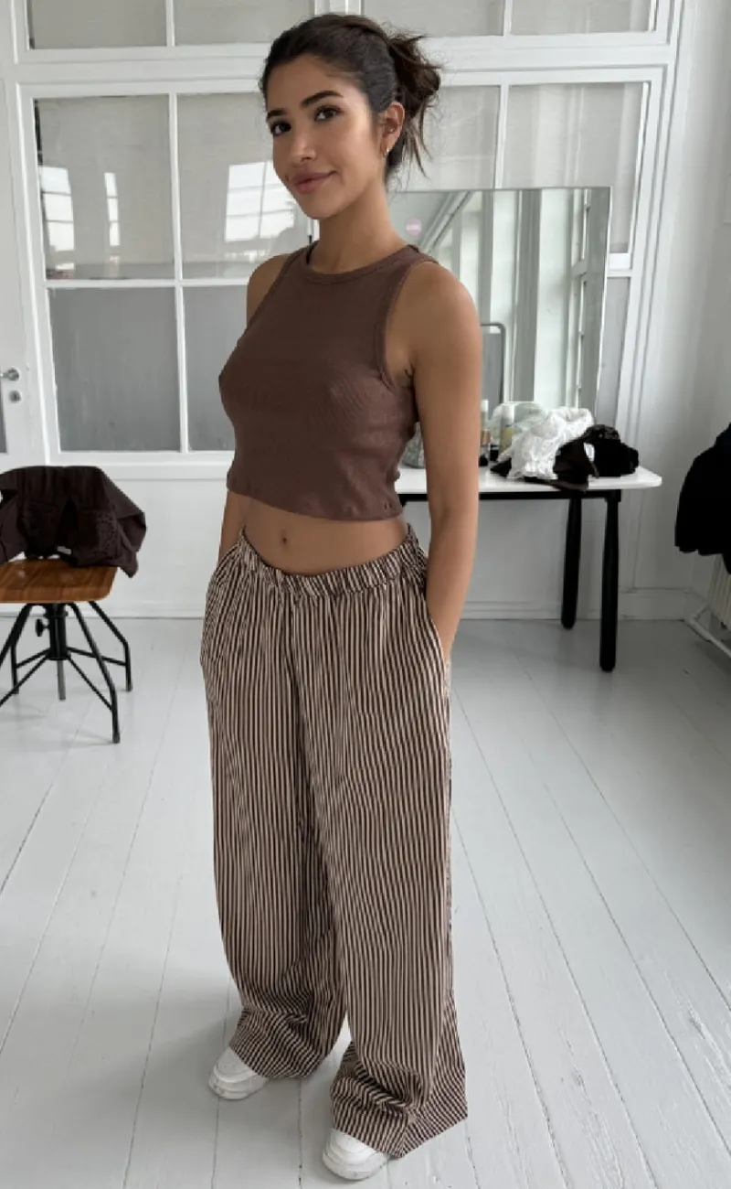 Bukserne har elastik i taljen og en smule vidde i benene.