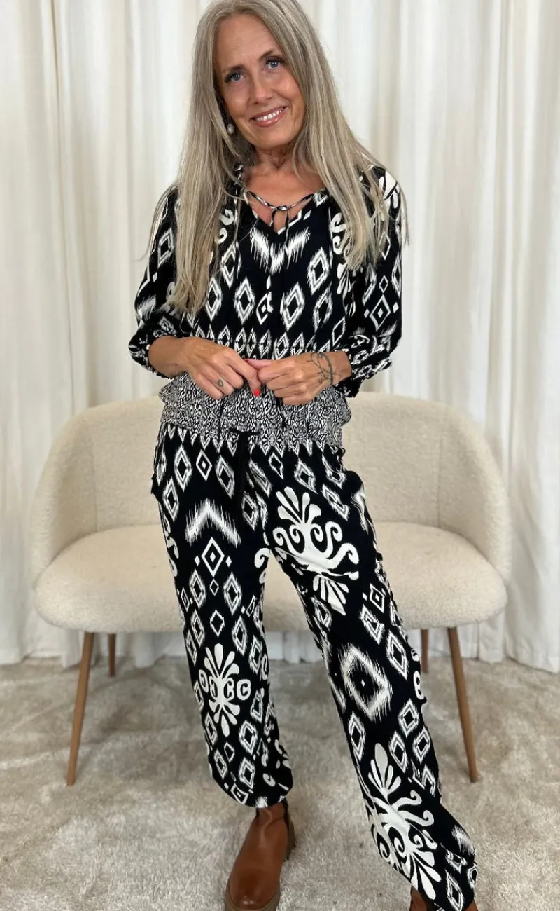Bukserne er perfekte at style med matchende INA Copenhagen Bluse – Tora – Black/White Paisley, men kan også styles med f.eks. en ensfarvet bluse.