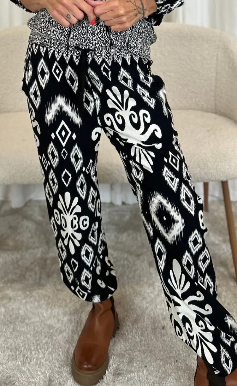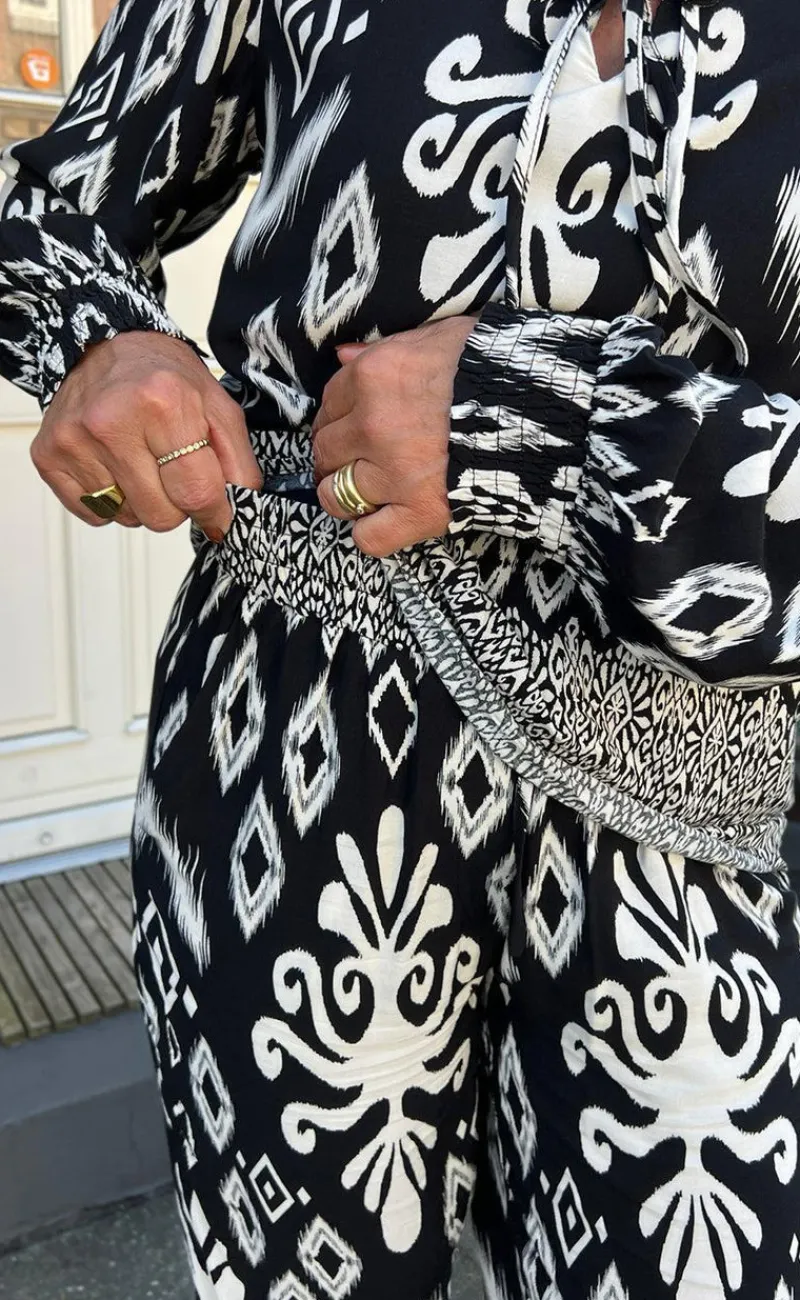 Fine bukser fra INA Copenhagen i sort med et hvidt paisley mønster.