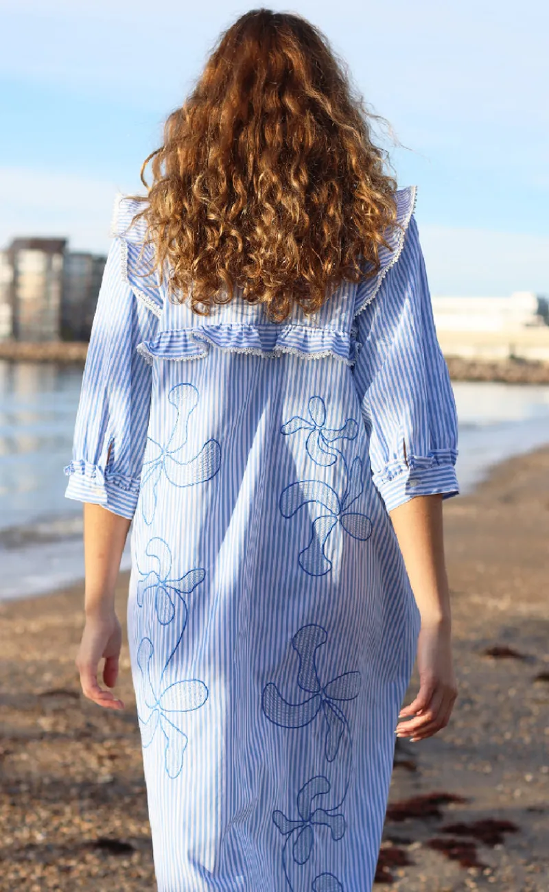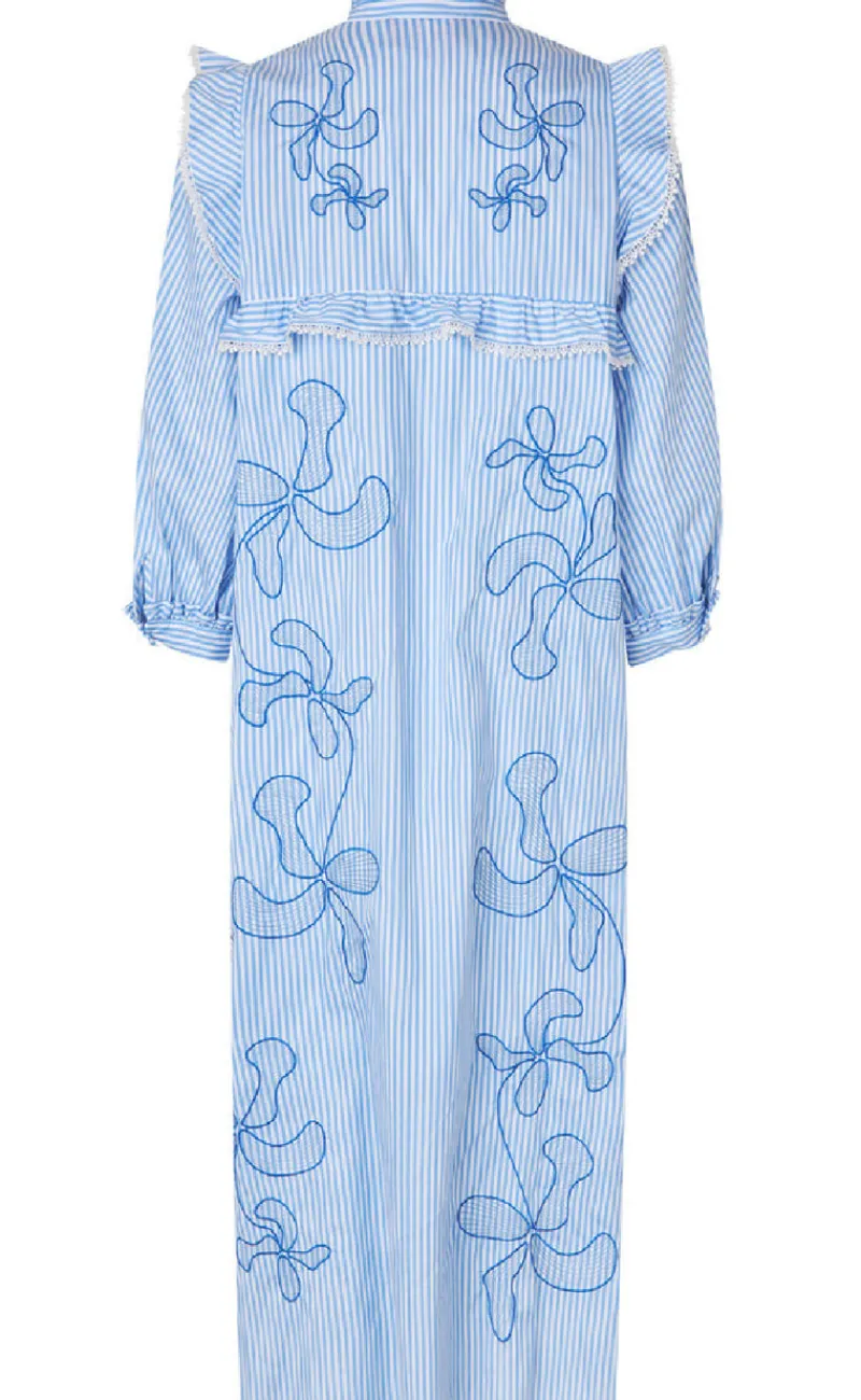 Elegant midi kjole fra Cras i et blå stribet print, med blå broderi detaljer.