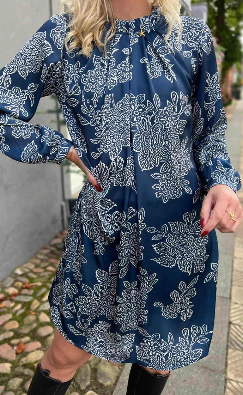 Smuk kjole fra INA Copenhagen i navy blå med de smukkeste detaljer ved halsen og fortil ved brystet.