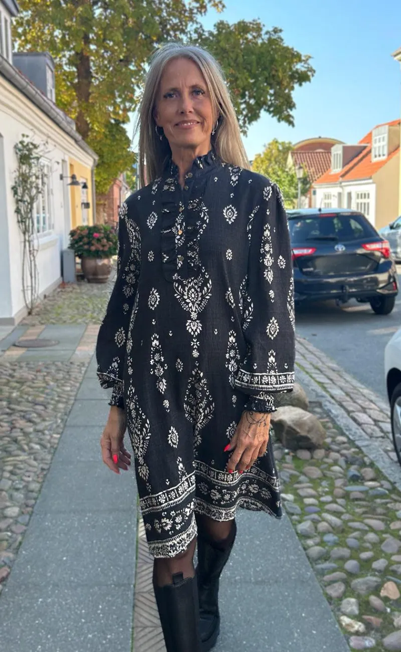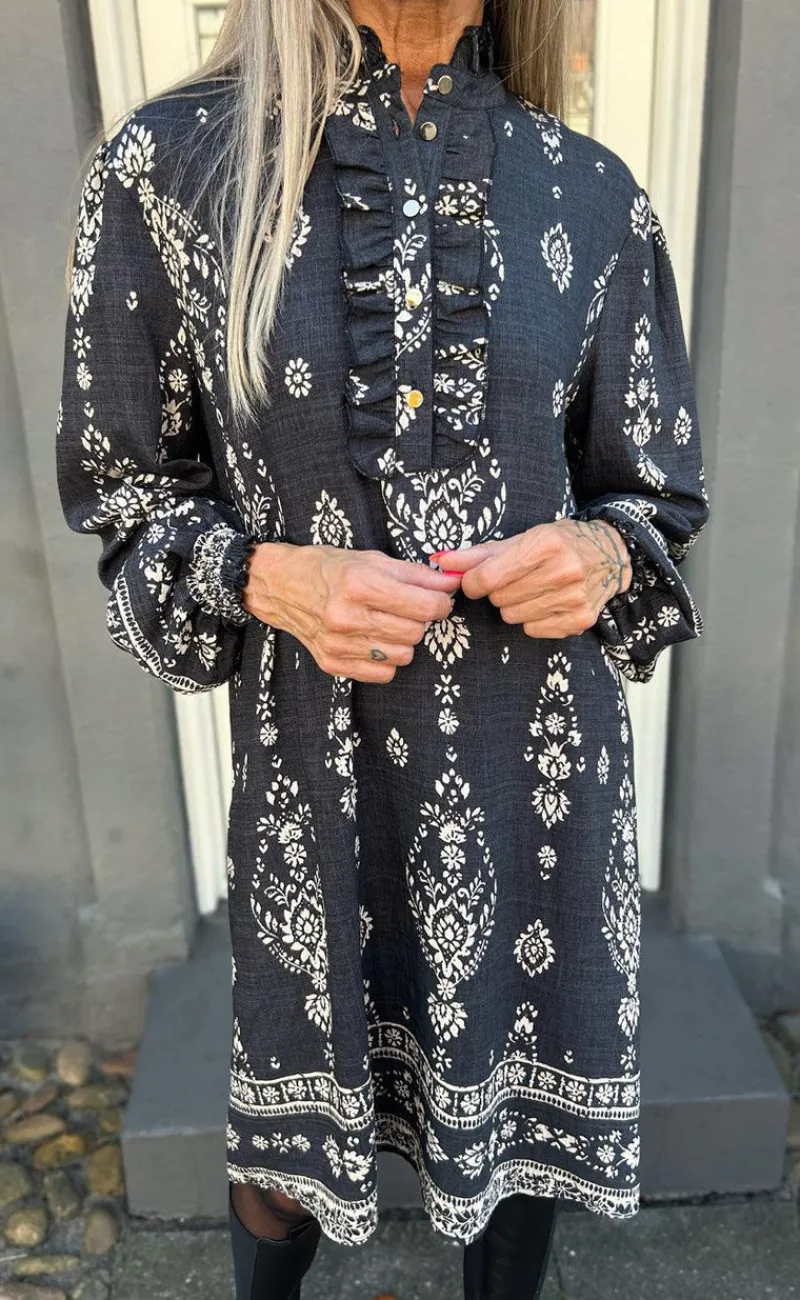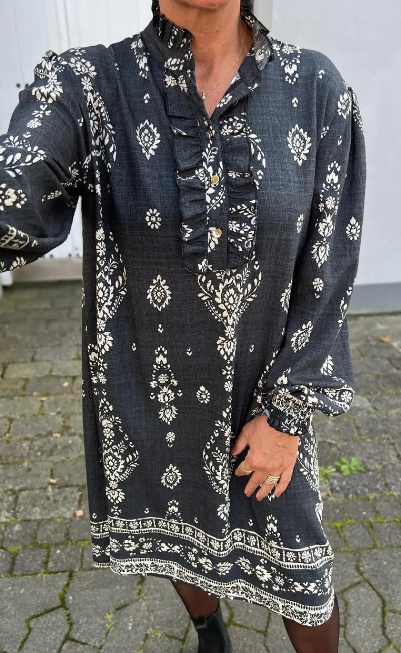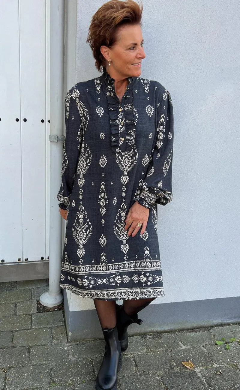 Eksklusiv kjole fra INA Copenhagen i antracit farvet med paisley print.