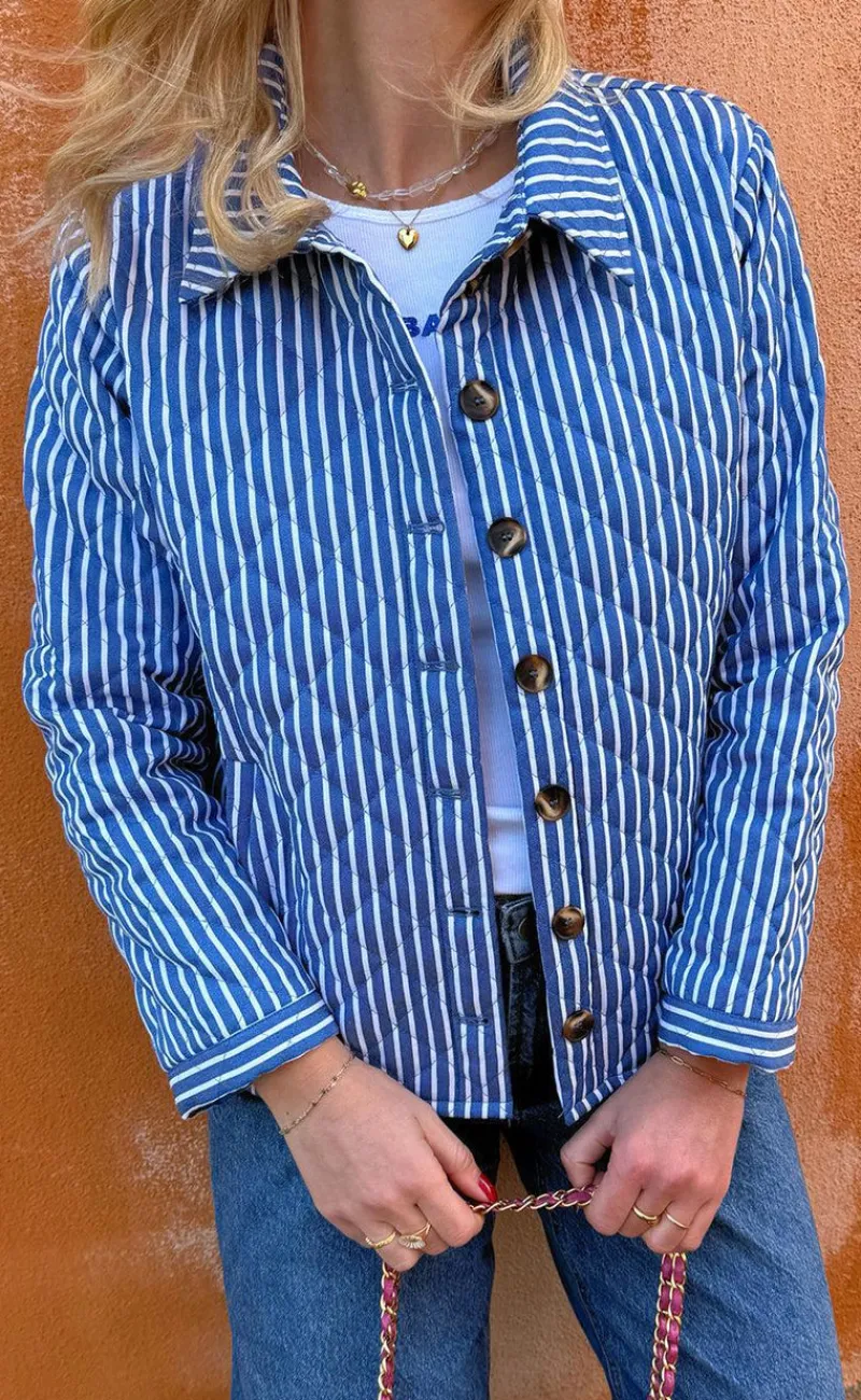 Smart jakke fra INA Copenhagen i blå- og hvidstribet quilt.