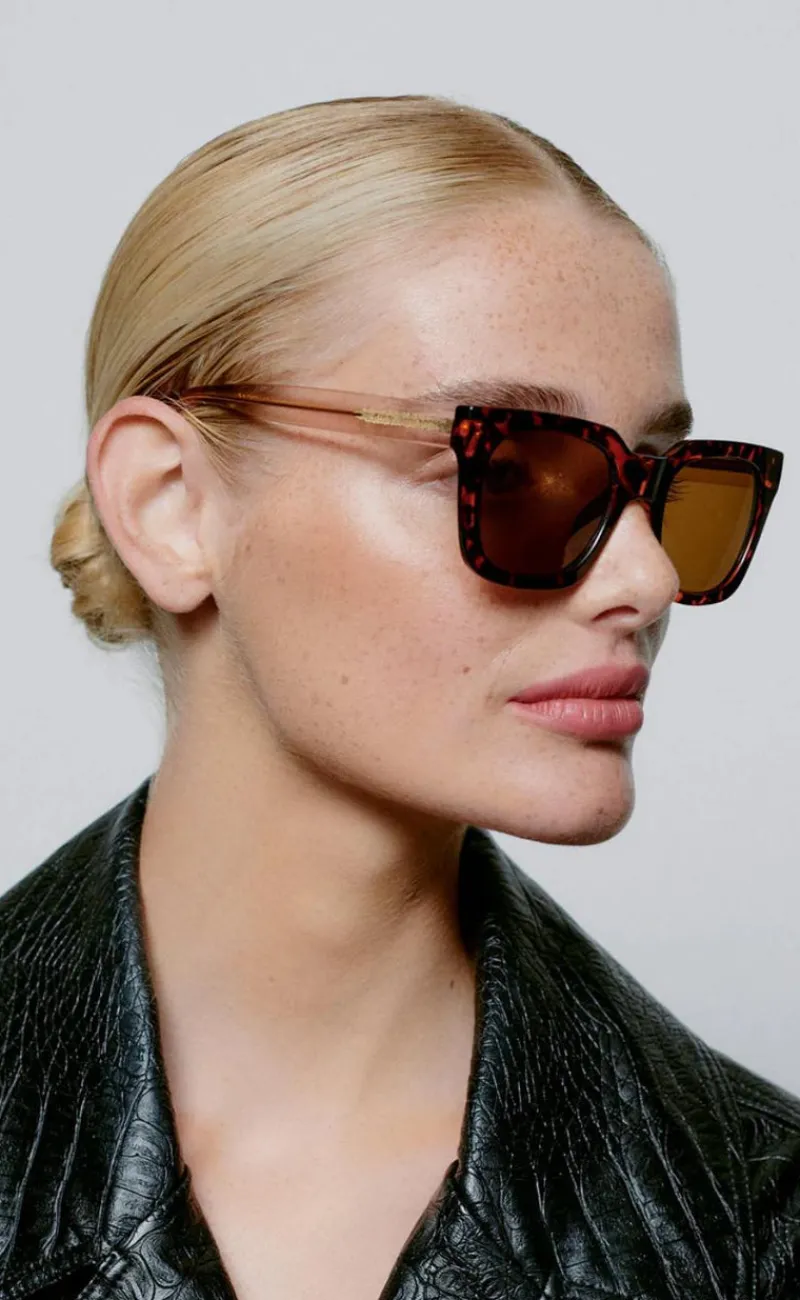 Seje solbriller i en brunlig nuance, med guld i stellet på siden.
