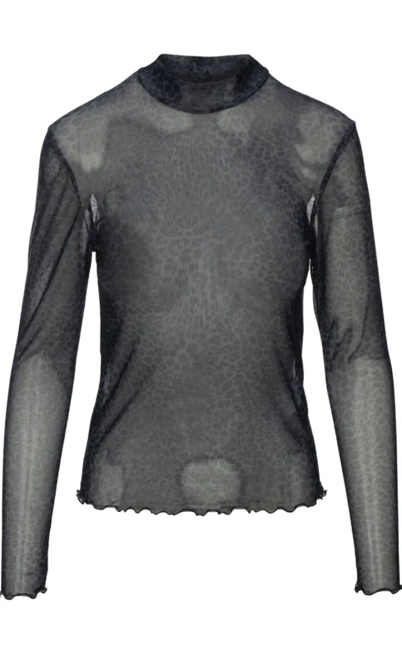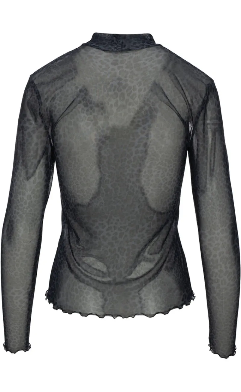 Blusen er gennemsigtig og har et fint mønster.