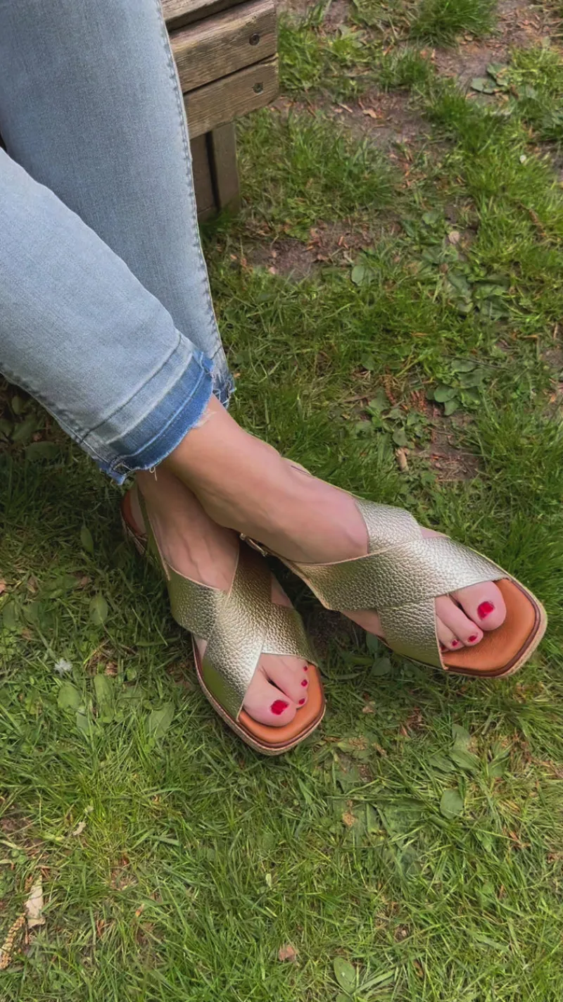 Sandalen har en smart krydsrem over forfoden, og om anklen som er justerbar. Sandalen har en rundet snude, en behagelig hæl og en blød gummisål i memory skum, så de er virkelig gode og behagelige at gå i.