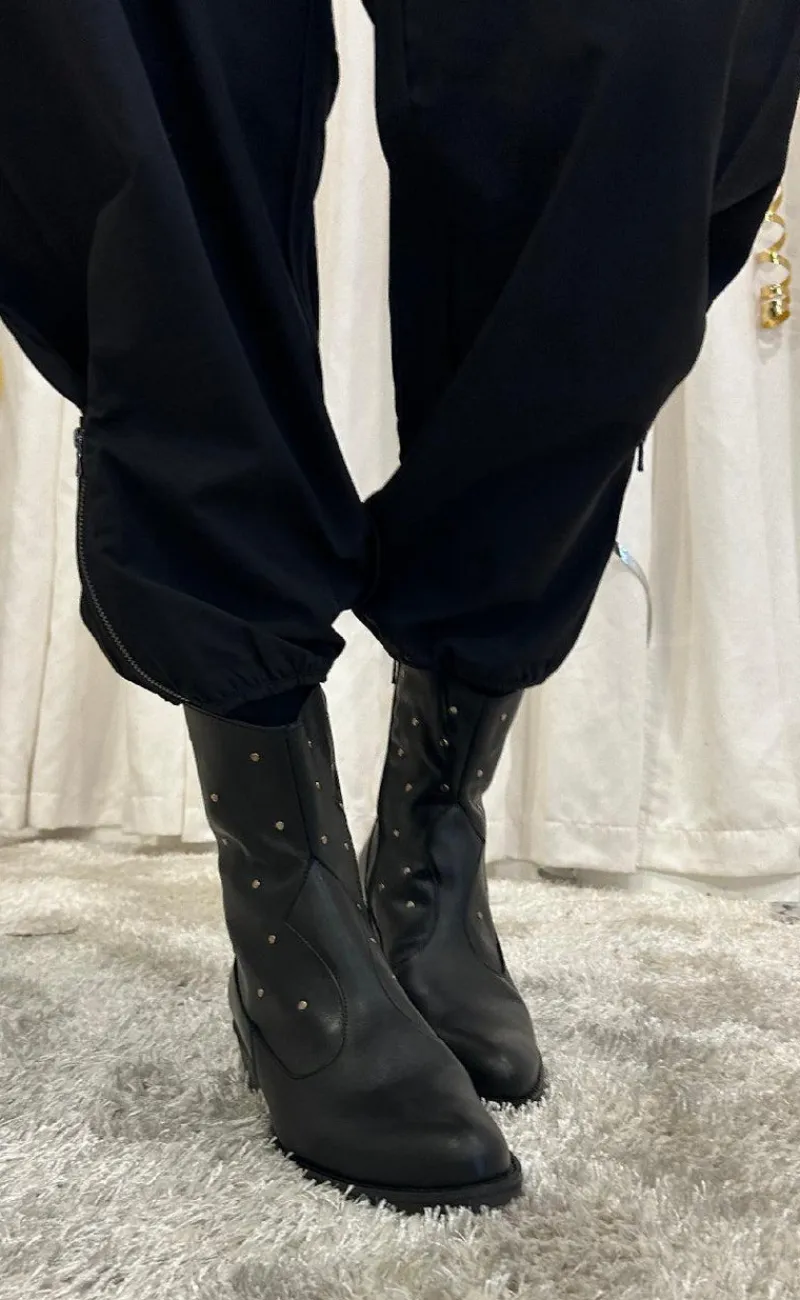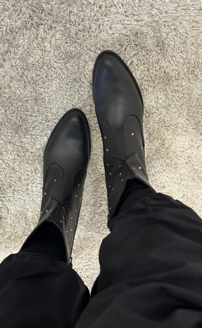 Støvle har nitter, lynlås og gummi sål.