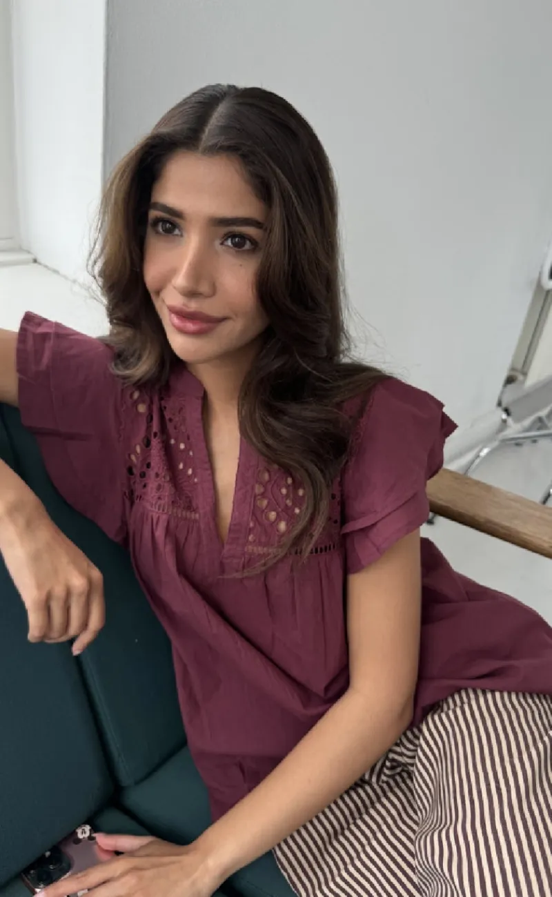 Toppen har broderi anglaise detaljer ved brystet samt korte ærmer med flæsekant.