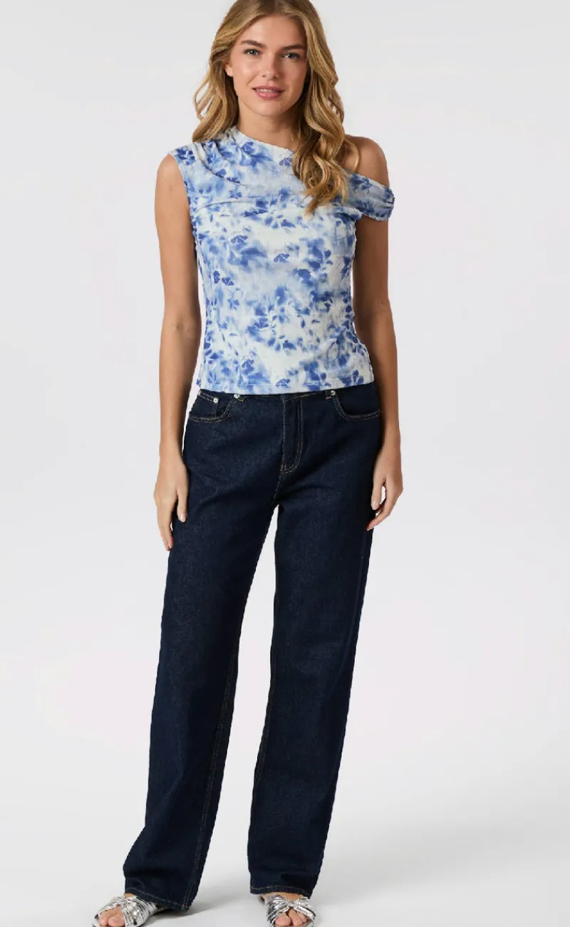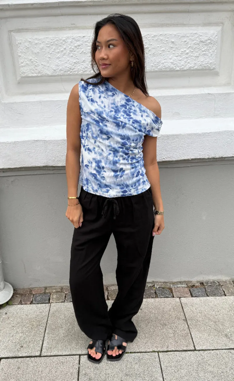 One-shoulder top fra Neo Noir i et blåt blomsterprint.