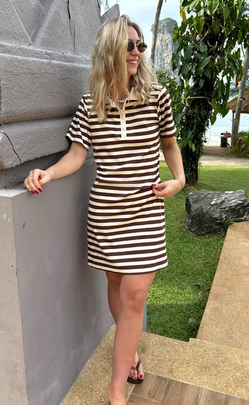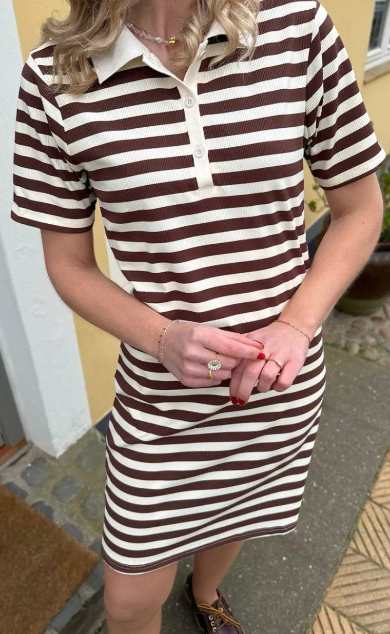 Smart polo kjole fra INA Copenhagen med striber i brun og off white.