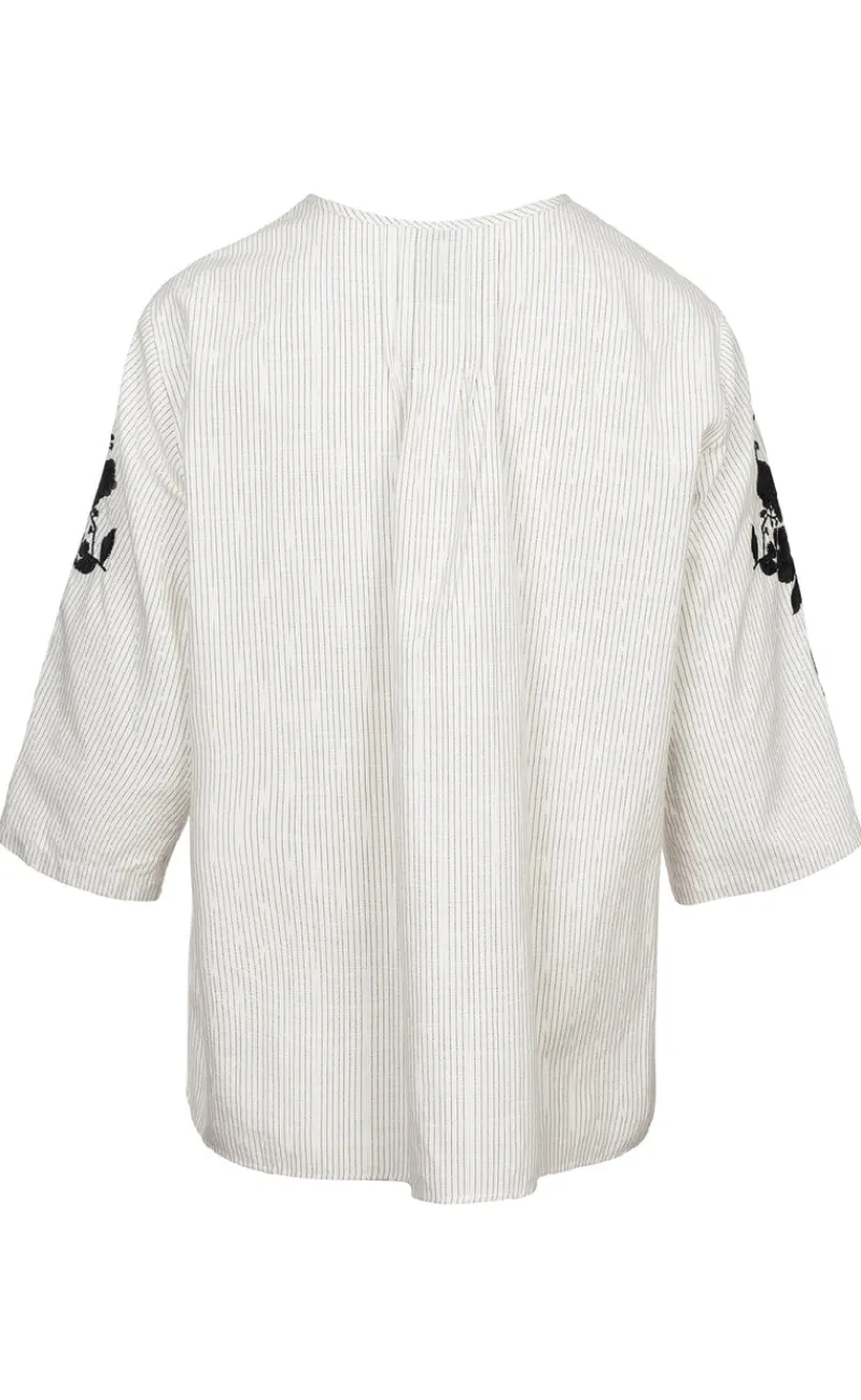 Elegant og komfortabel bluse fra Luxzuz i en creme hvid farve – med et smukt, broderet mønster på ærmerne og fine striber i stoffet.