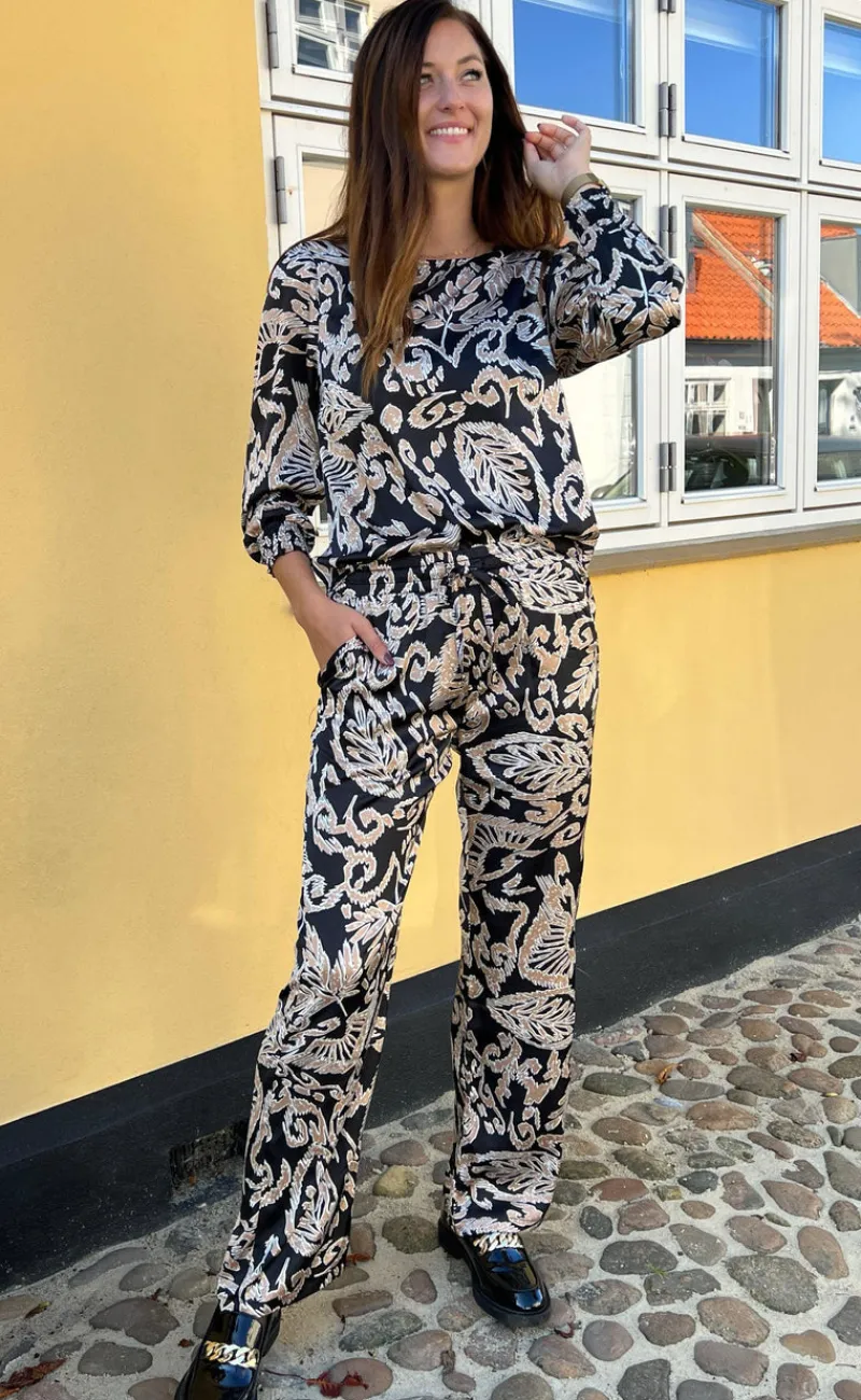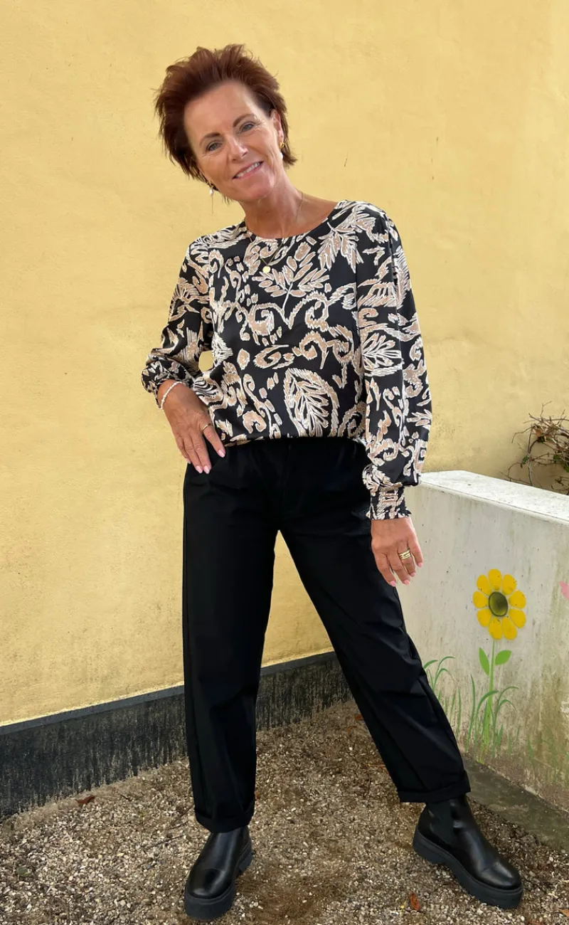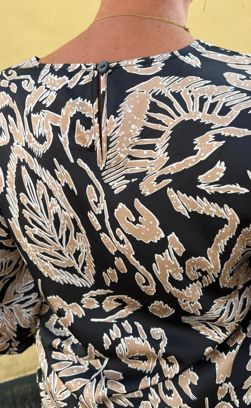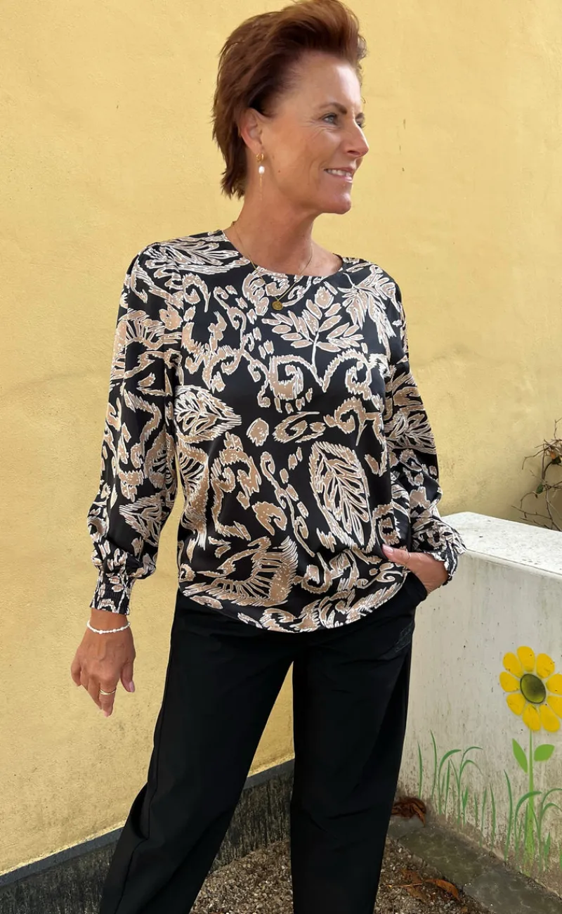 Super smuk bluse fra INA Copenhagen i sort med print af brune blade.