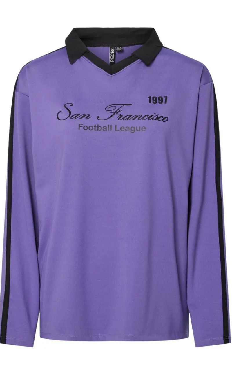 Fin polo bluse fra Pieces i lilla med skriften “San Fransisco” Stående langs brystet.
