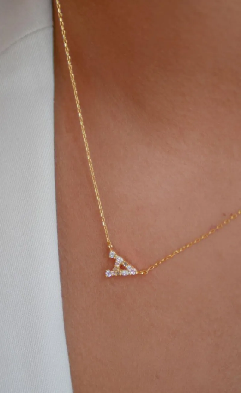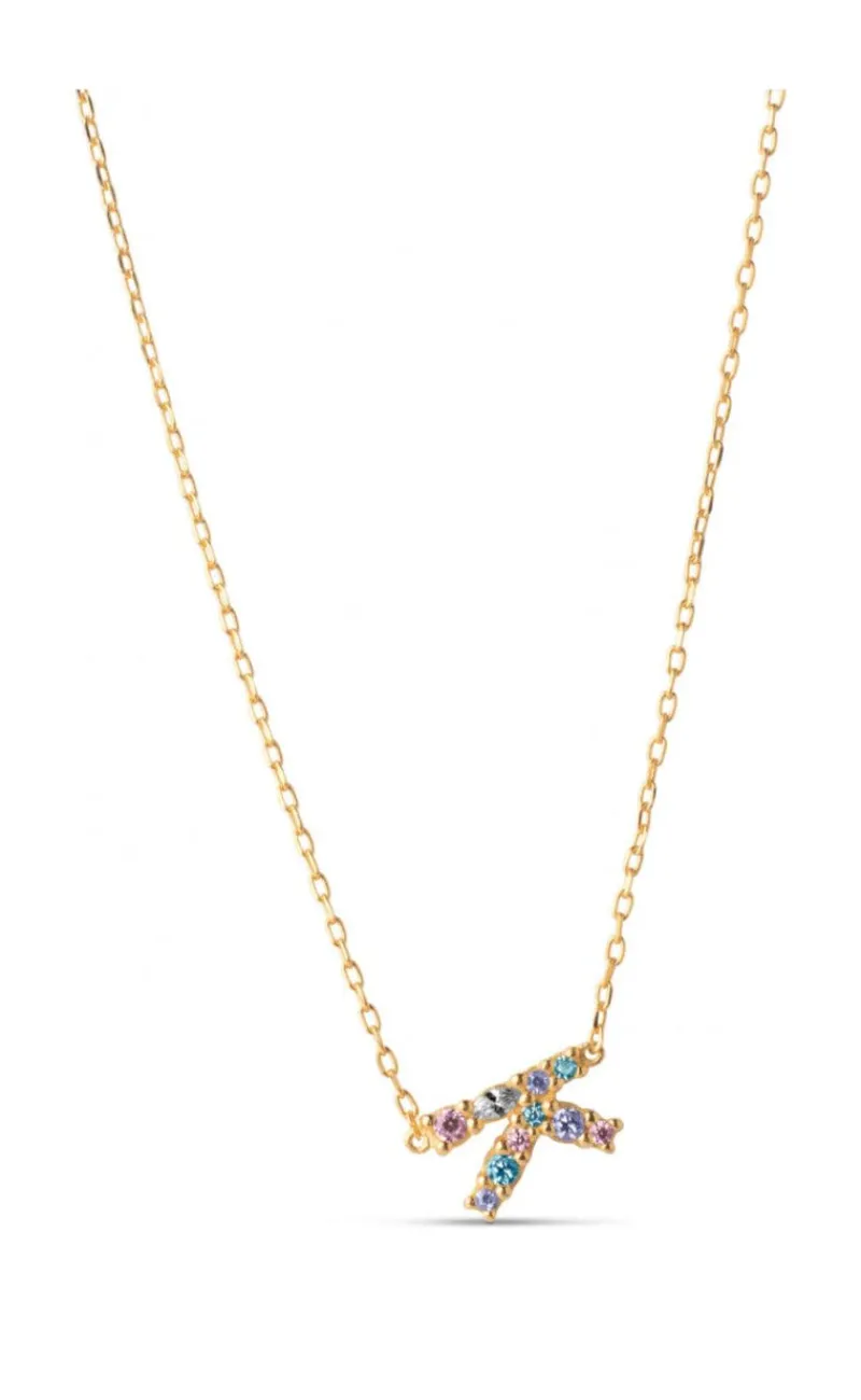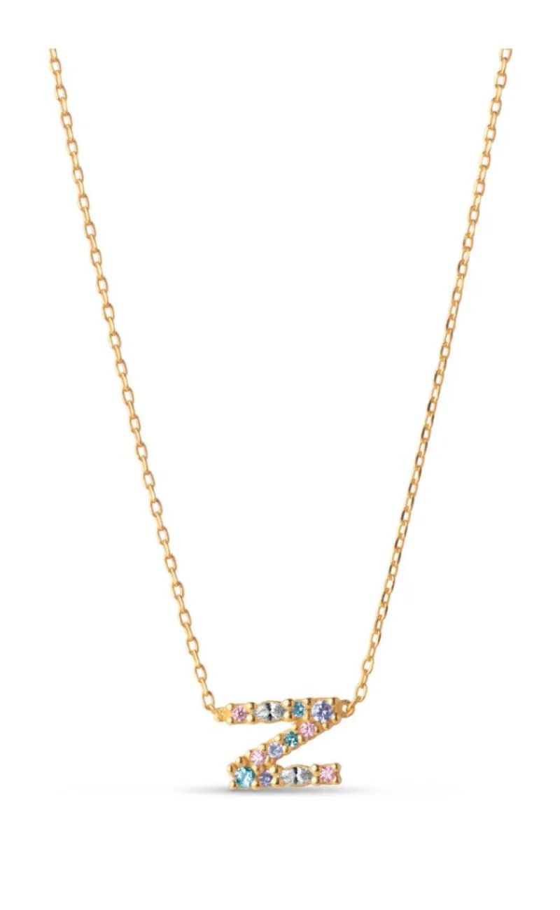 ENAMEL Copenhagen halskæde i guld med et fint bogstav-vedhæng med forskellig-farvede sten.