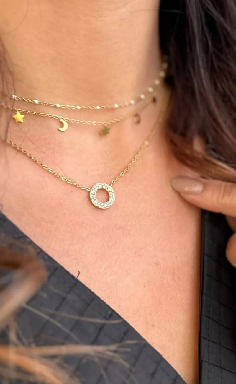 Eksklusiv halskæde fra Smykkeli Copenhagen i guld med et rundt vedhæng med små zirconia sten. Halskæden har et stilrent look, der pifter ethvert outfit op.