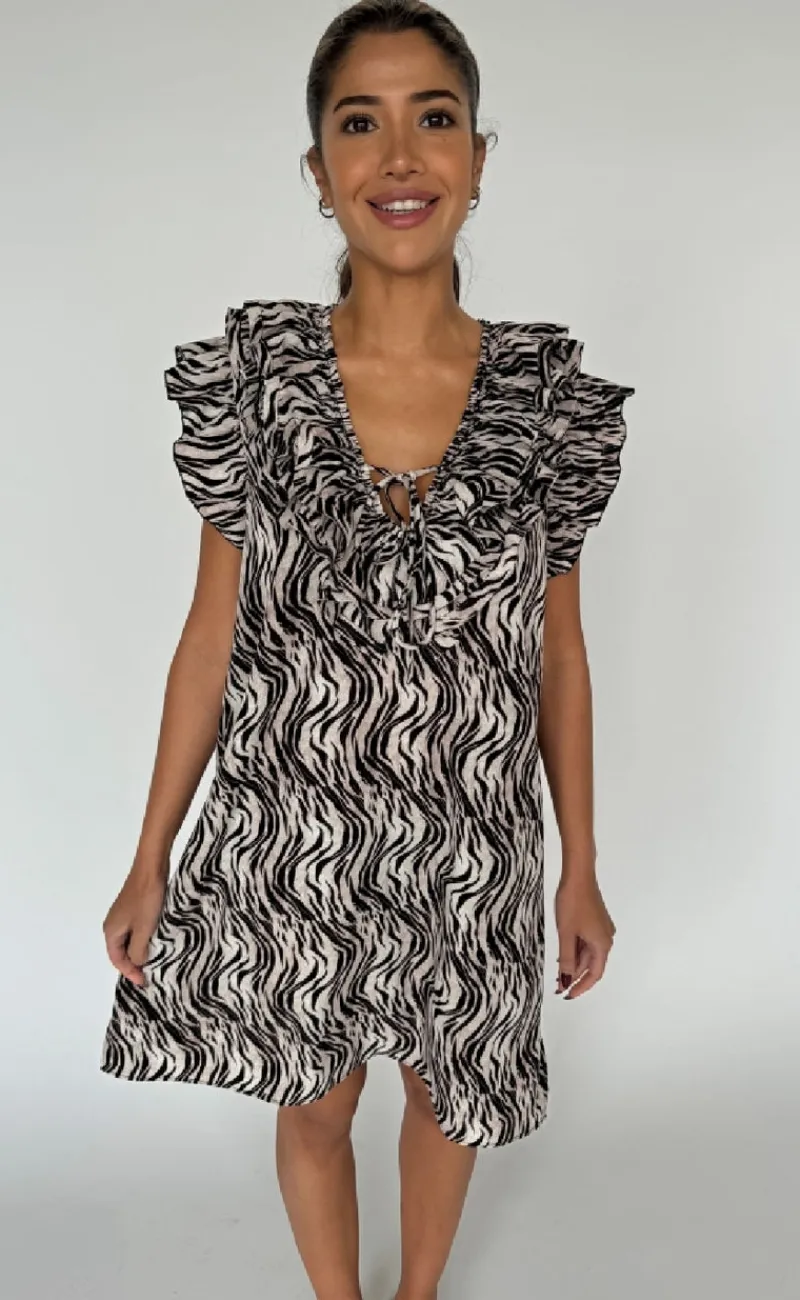 Kjolen har fine flæsedetaljer og er ærmeløs.