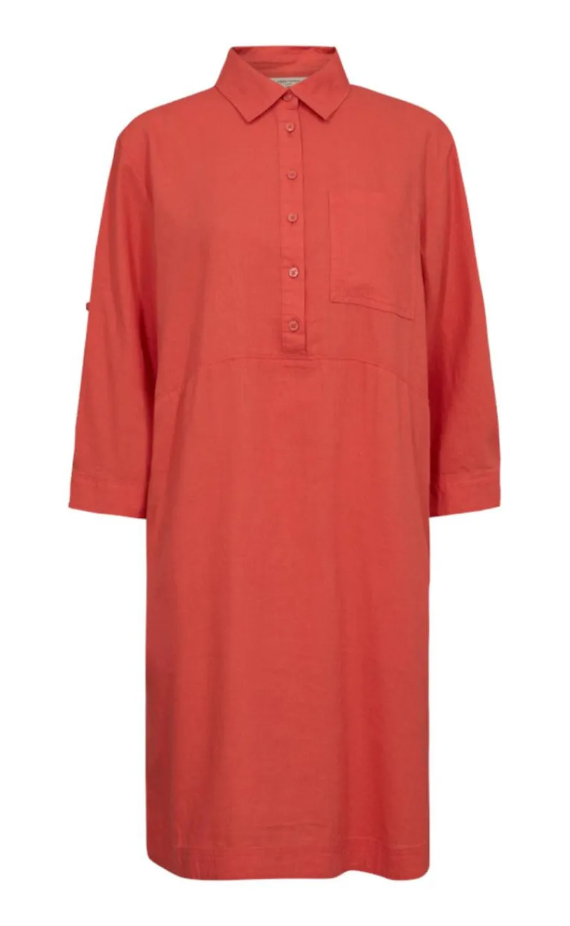 Den sødeste hør kjole fra Freequent i en coral farve.