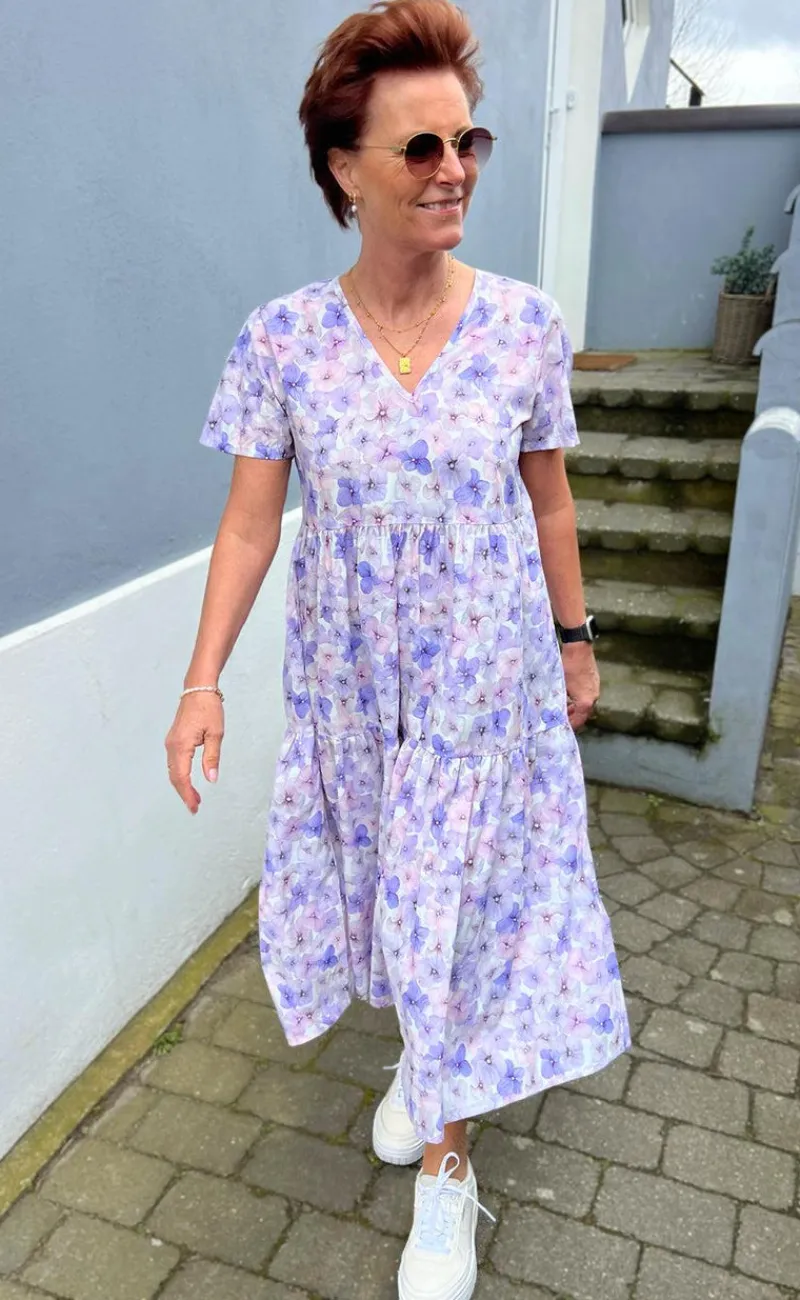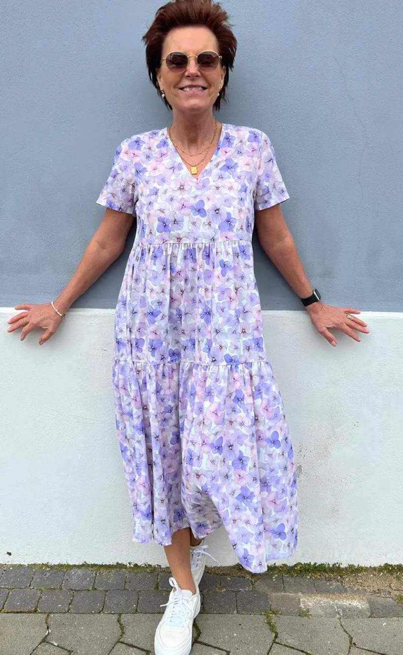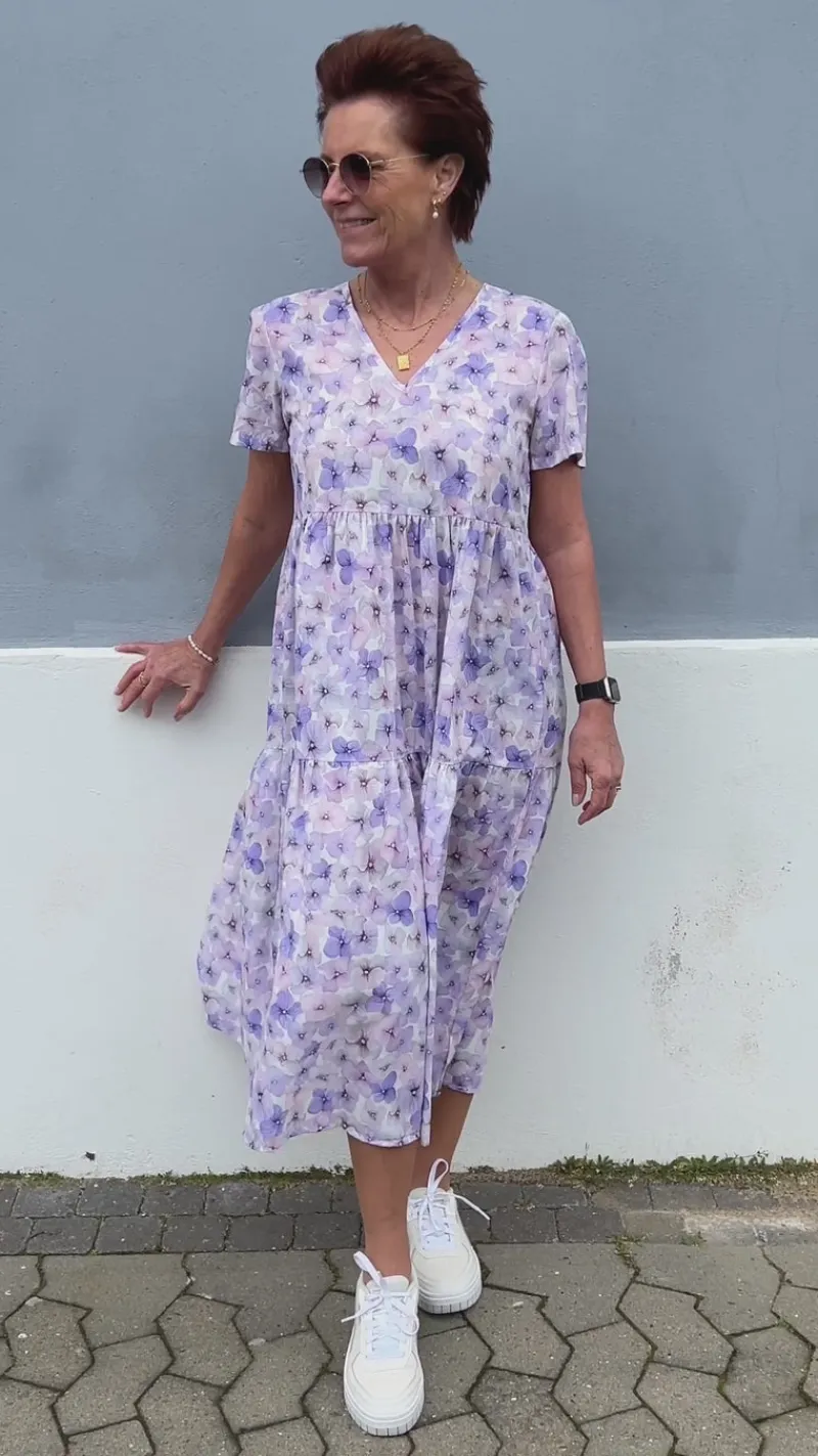 Kjolen er lavet i et skønt blomsterprint i lilla nuancer og er uden tvivl et must-have til garderoben.