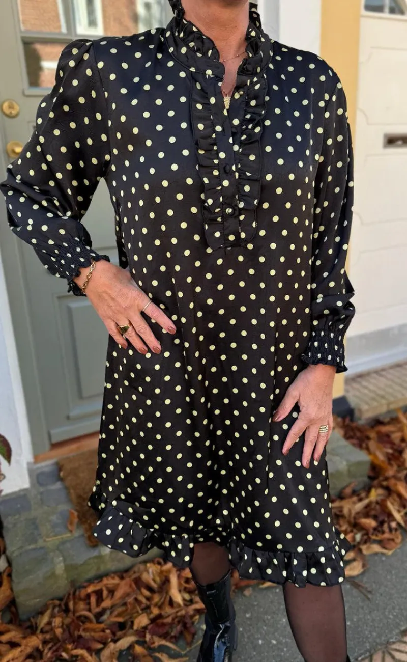 Smuk kjole fra INA Copenhagen i sort med grønne prikker.
