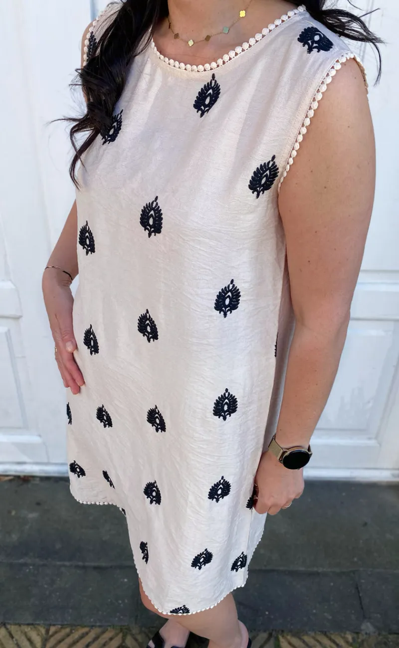 Moderne og simpel kjole fra INA Copenhagen i beige med sort broderi.