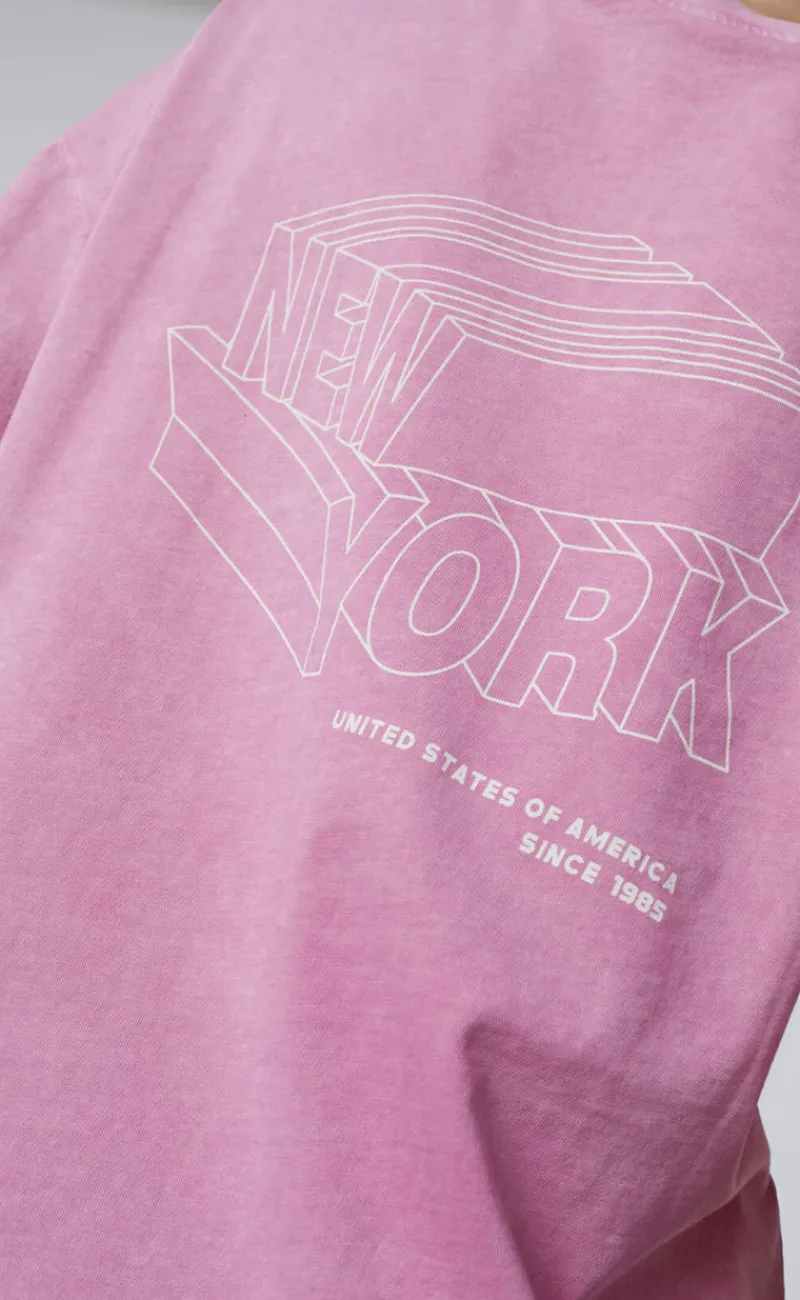 T-shirten har en løs pasform og print på ryggen.