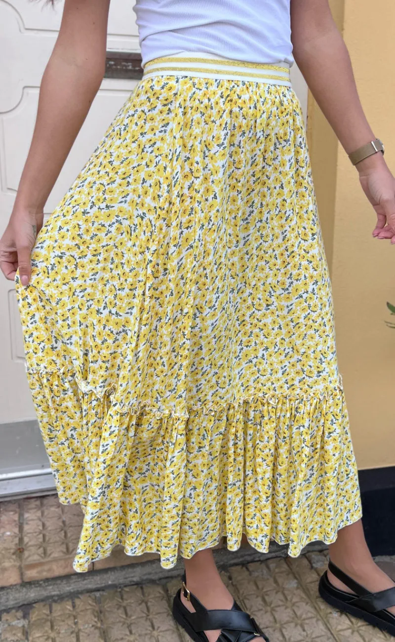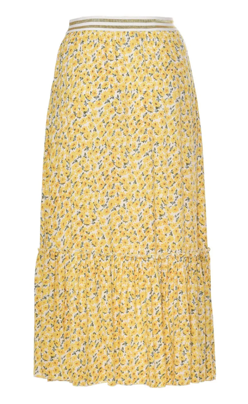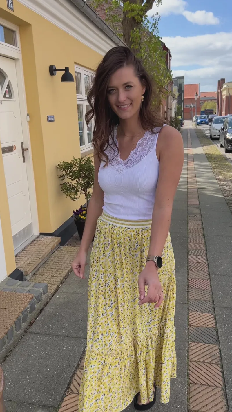 Smuk nederdel fra INA Copenhagen i hvid med gule blomster og grønne stilke.