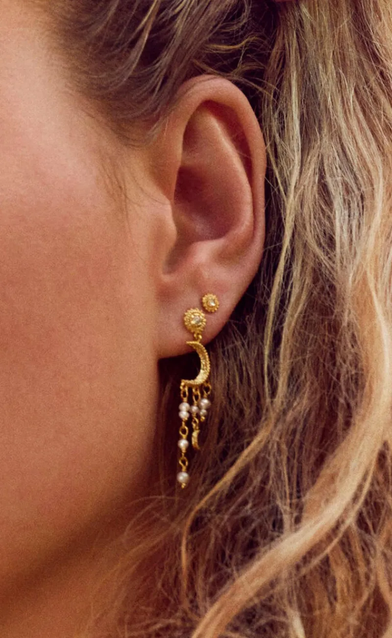 Øringene har en variation af ferskperler og guld ringe hængende ned langs øret. Samt udsmykket med smukke sol og måne symboler.