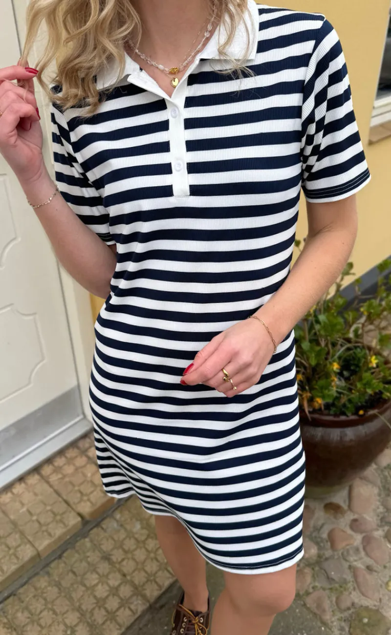 Smart polo kjole fra INA Copenhagen med striber i navy og off white.