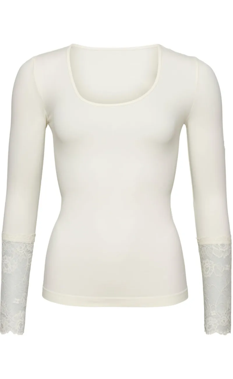 Blusen har lange ærmer med blonder, som giver et elegant look.