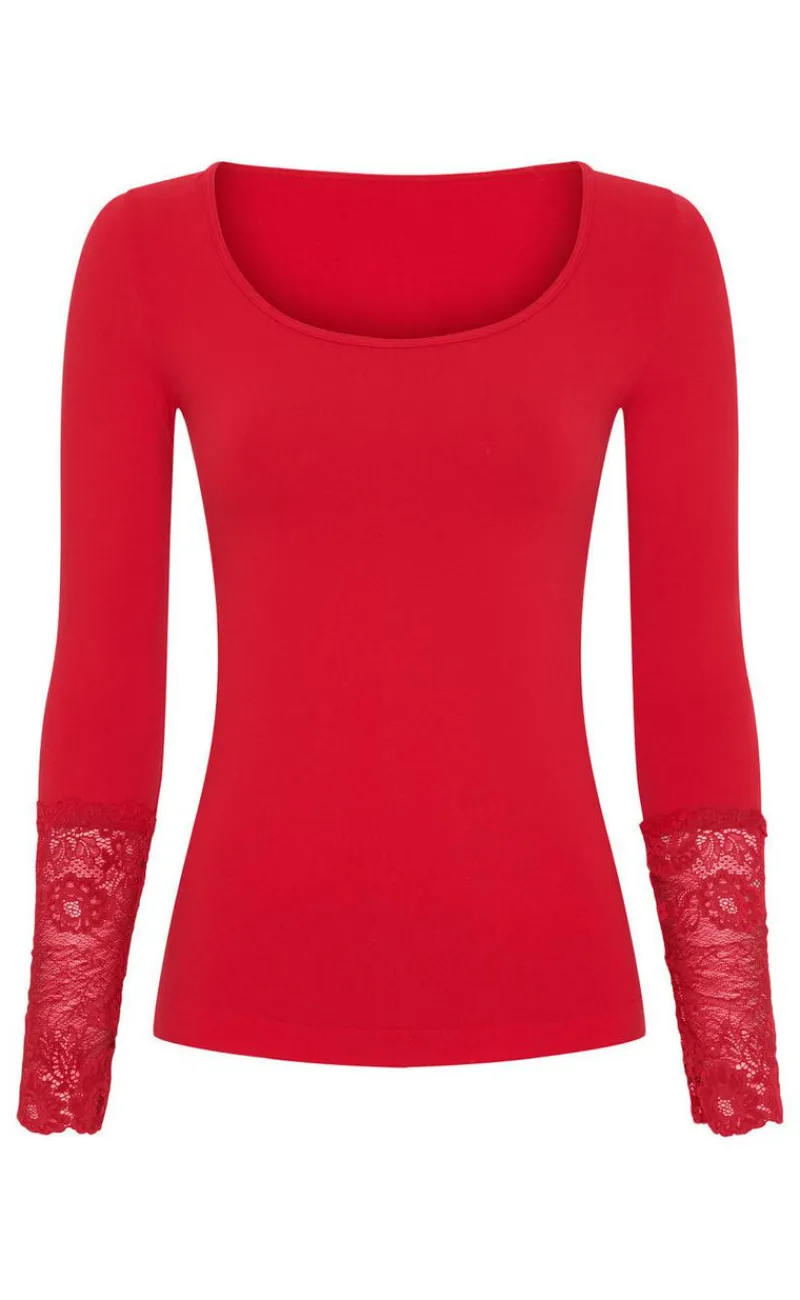 Blusen har lange ærmer med blonder, som giver et elegant look.