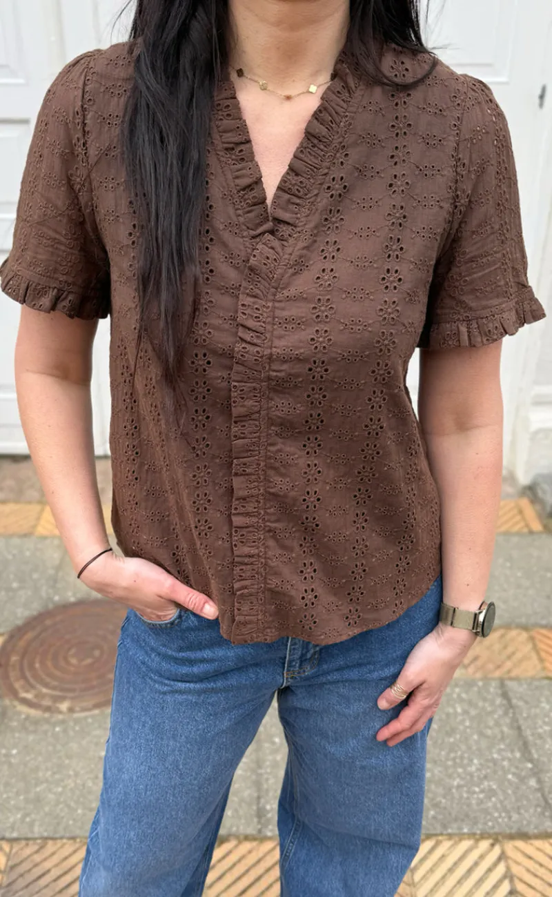 Smuk t-shirt fra INA Copenhagen i brun broderie anglaise med så mange fine detaljer.
