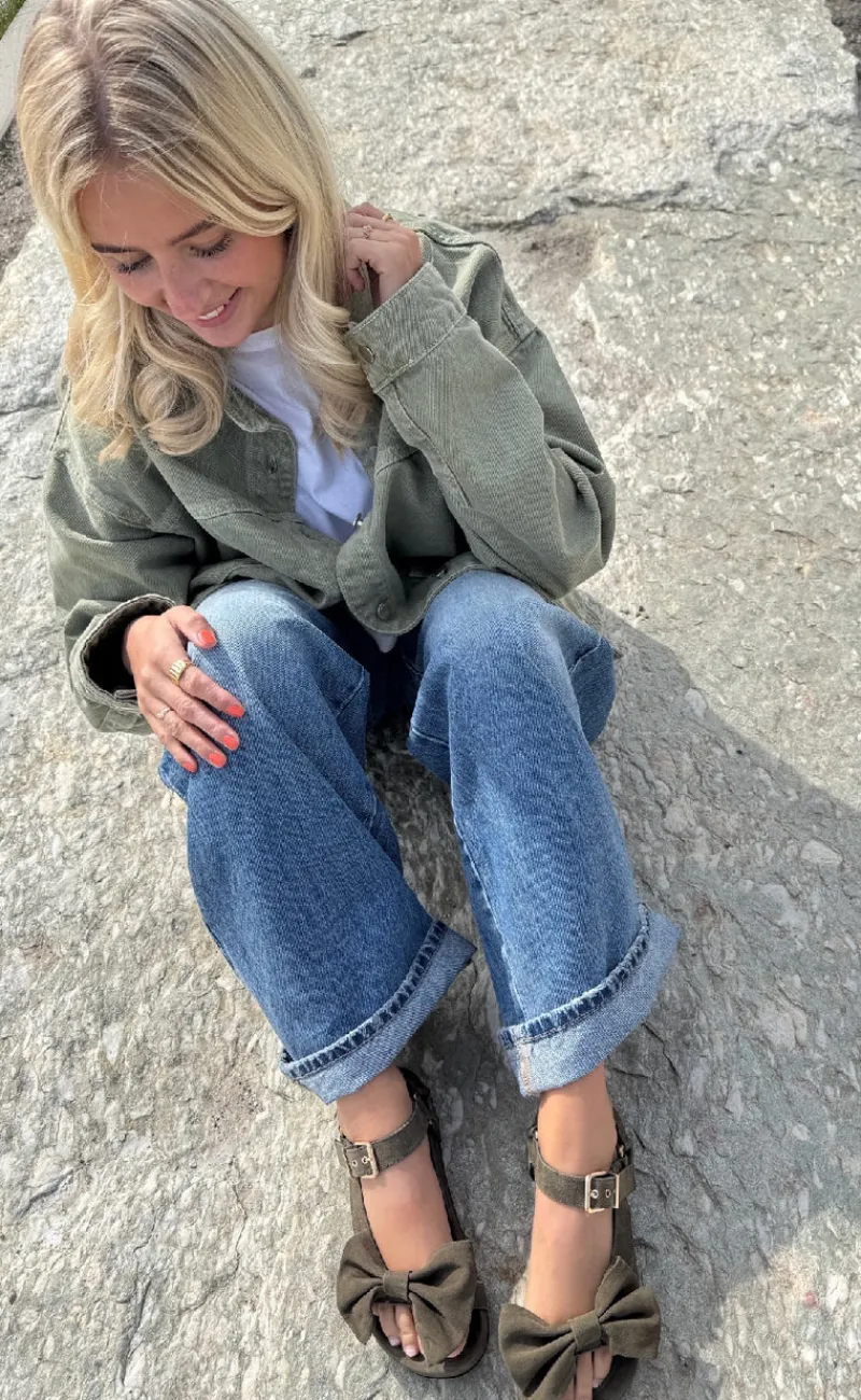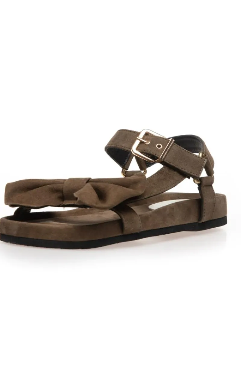 Denne sandal har en sløjfe på fronten, og en spænde rundt om anklen.