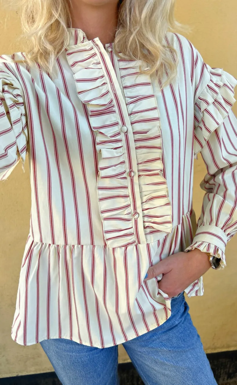 Skjorte har lange ærmer med flæse-ærmer og en åbning fortil med knapper og de smukkeste flæser.