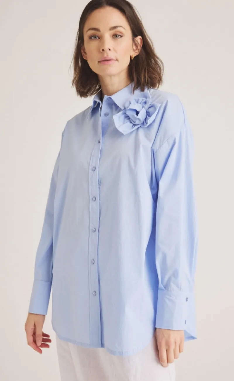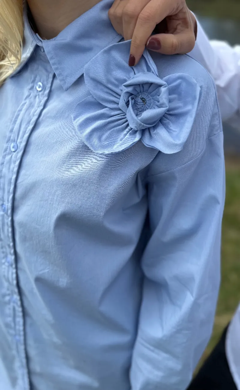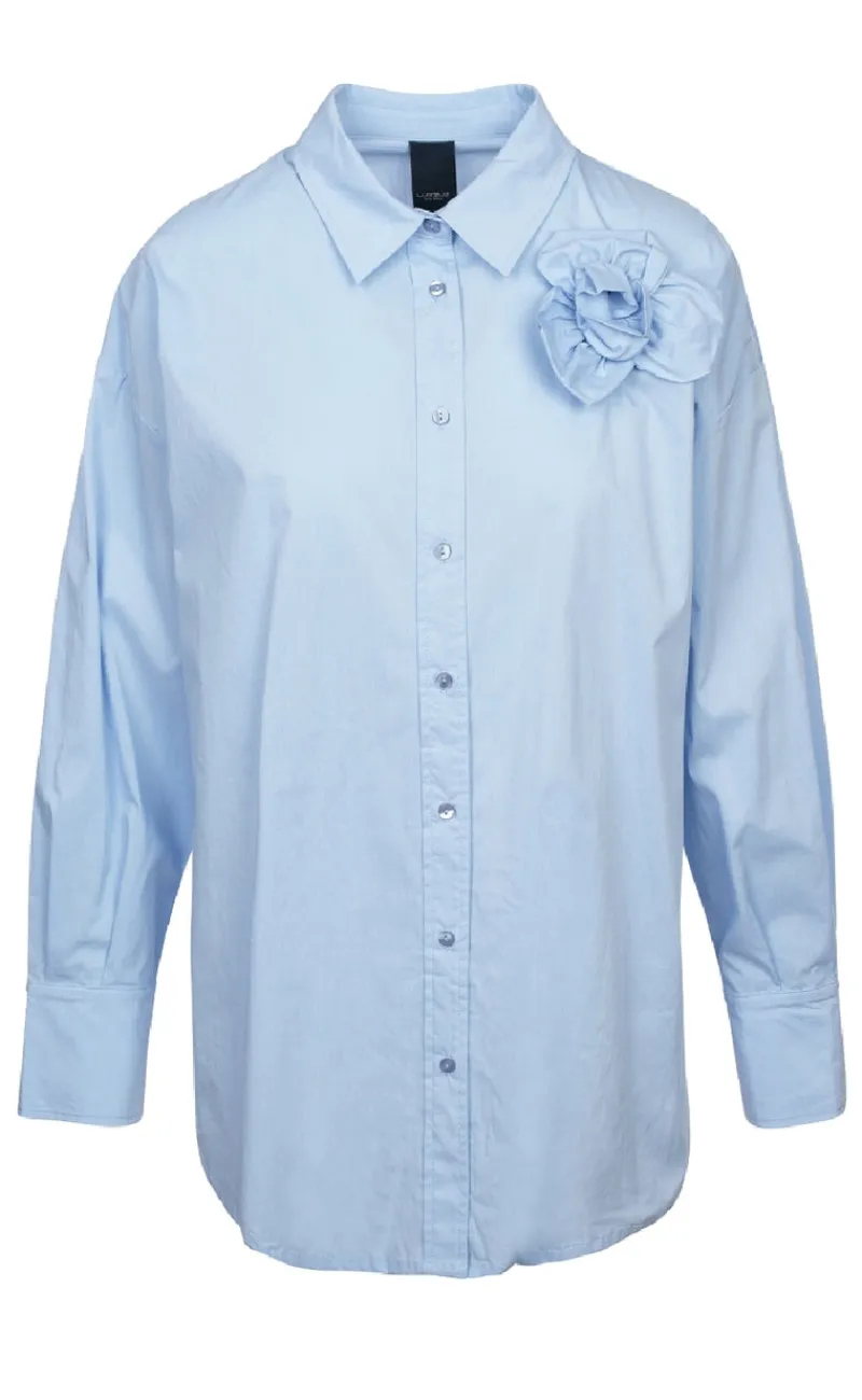 Cool skjorte fra Luxzuz i blå med en smuk aftagelig blomst ved skulderen.