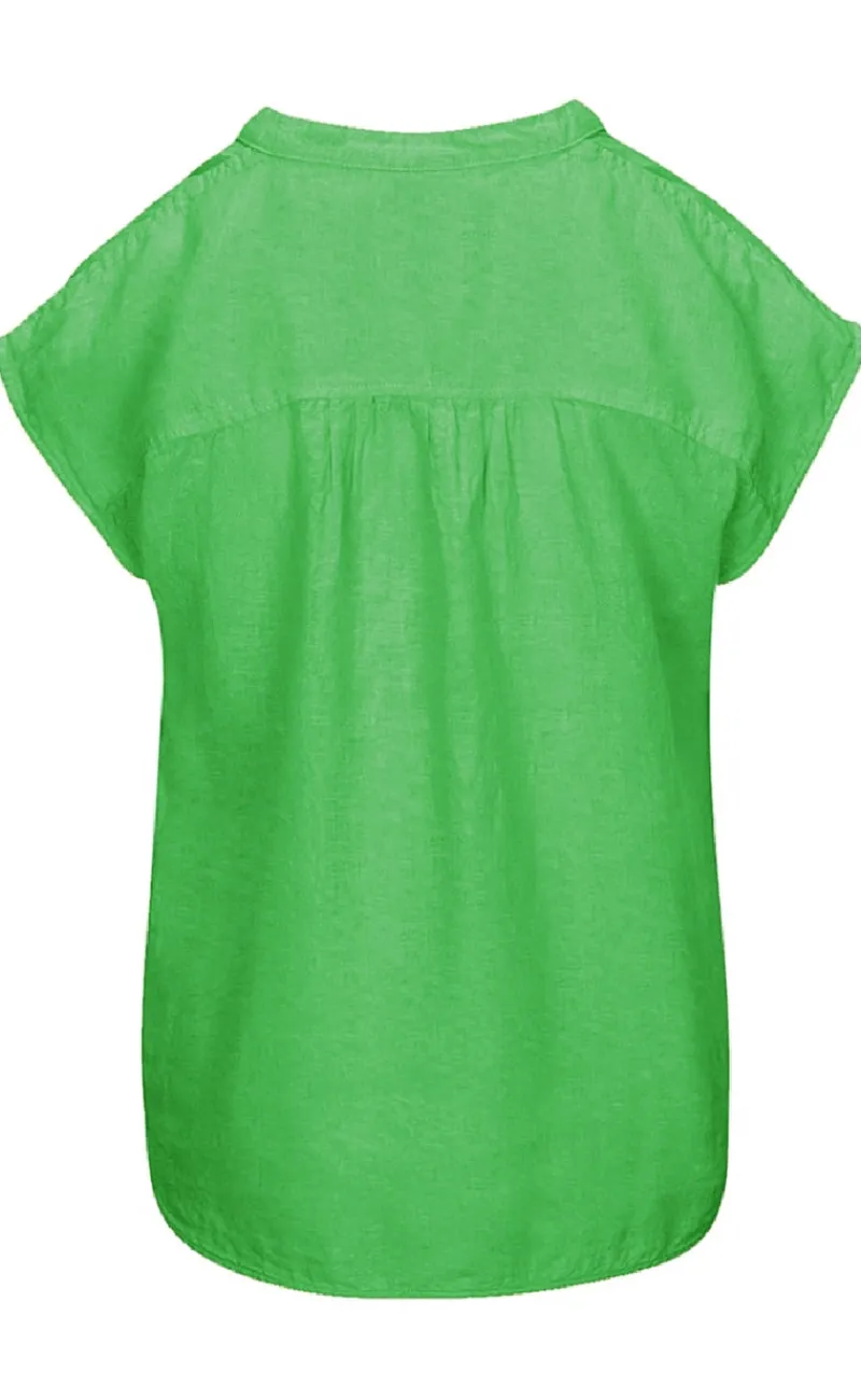 Toppen har en v-hals efterfulgt af en knaplukning samt korte ærmer.
