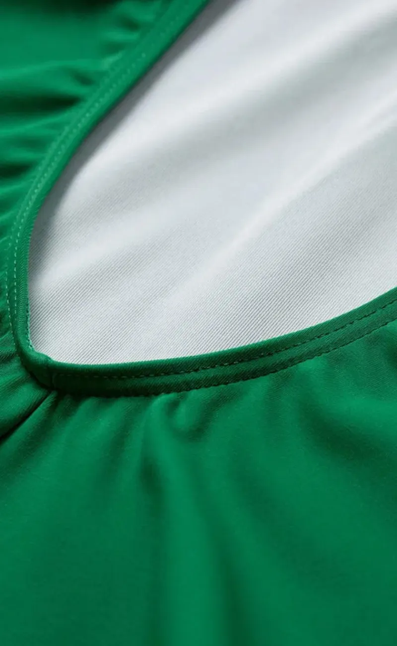 Badedragten er lavet af et fast og strækbart materiale med ekstra støtte omkring barmen, som smyger sig om din krop.