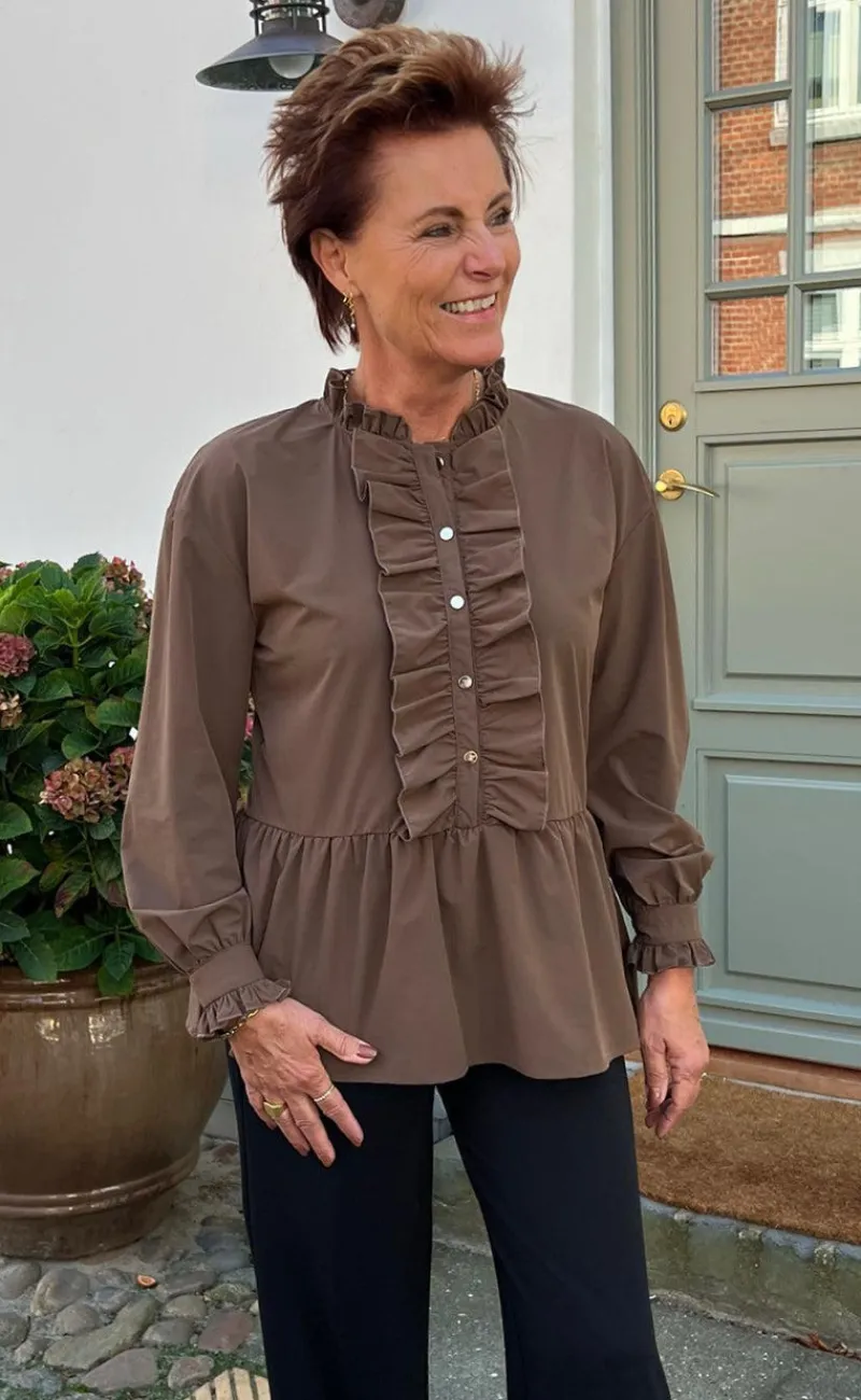 Elegant bluse med knapper på ærmet og ned langs. Blusen er brun og har de smukkeste flæser.