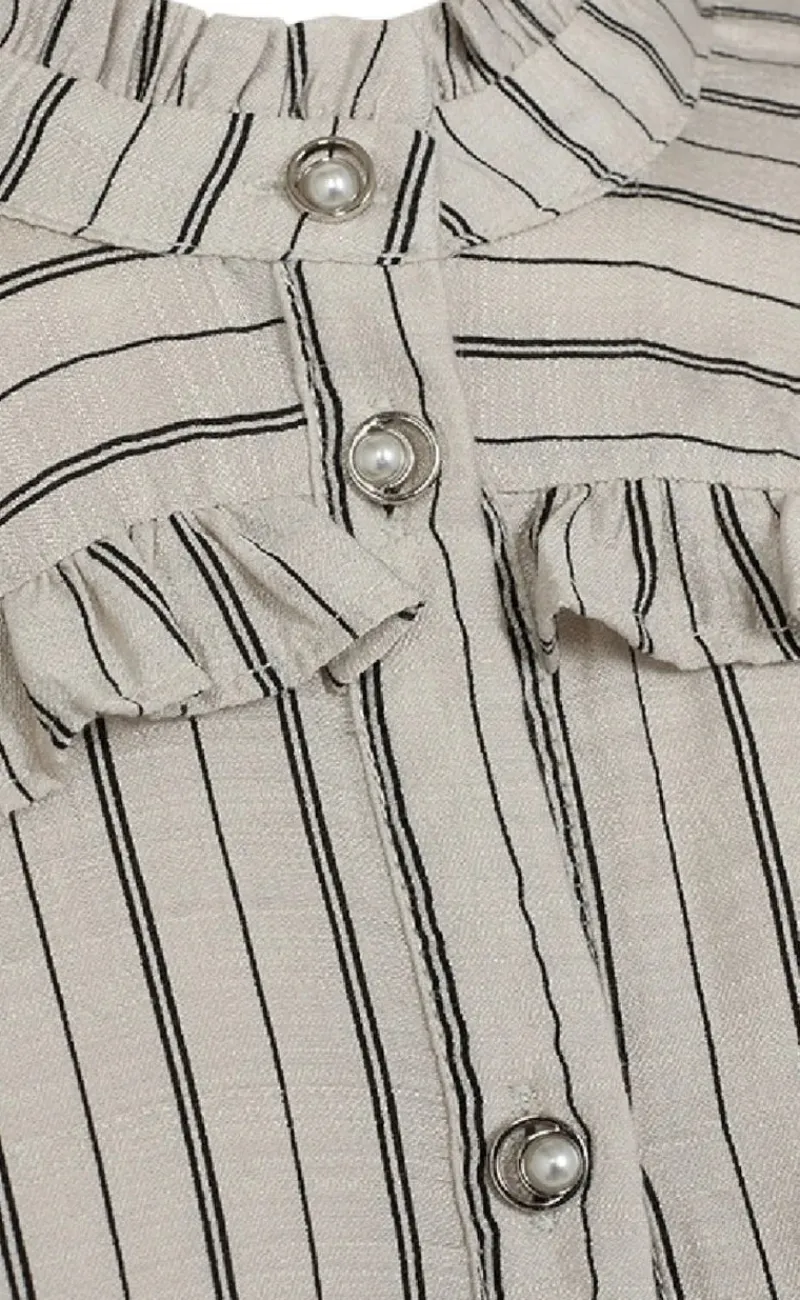 Blusen har rynke detaljer ved ærmerne samt knappelukning.