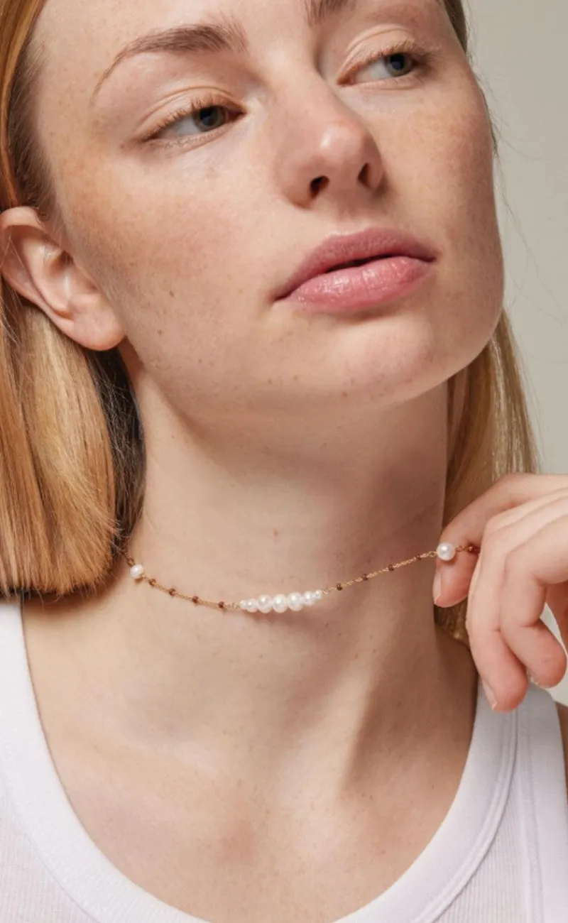 Flot halskæde fra Enamel Copenhagen i guld med perler samt brune sten.