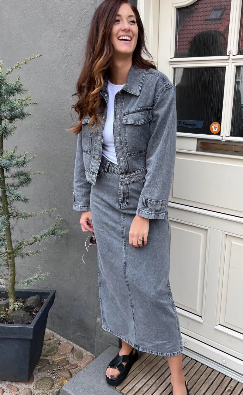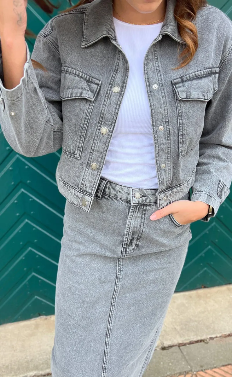 Fed denimjakke fra Gobal Funk, i en forvasket grå farve.