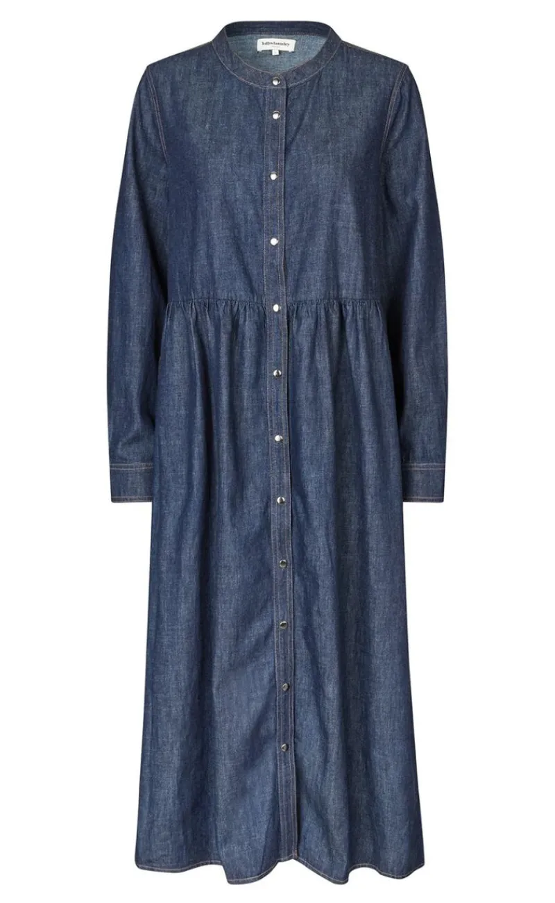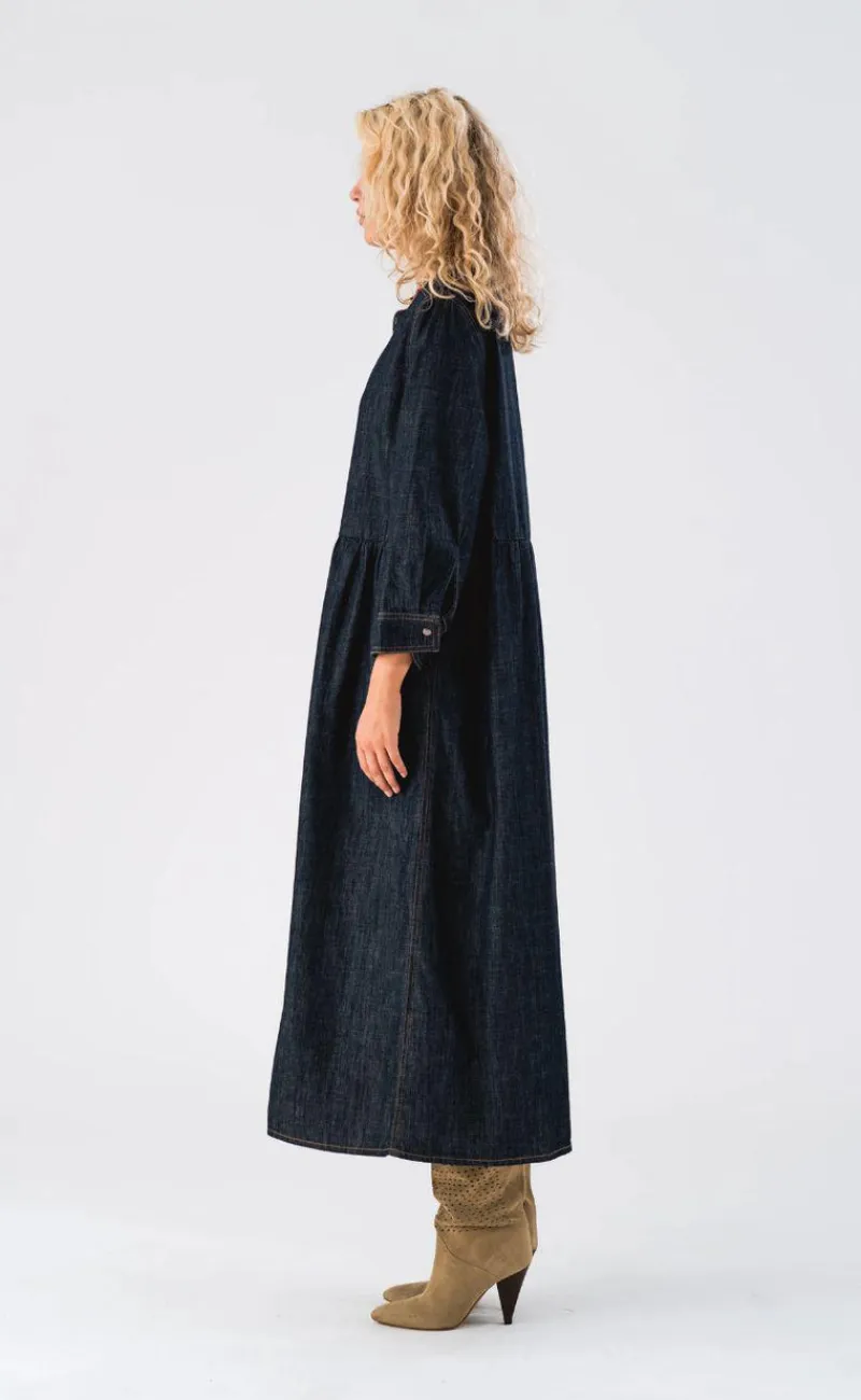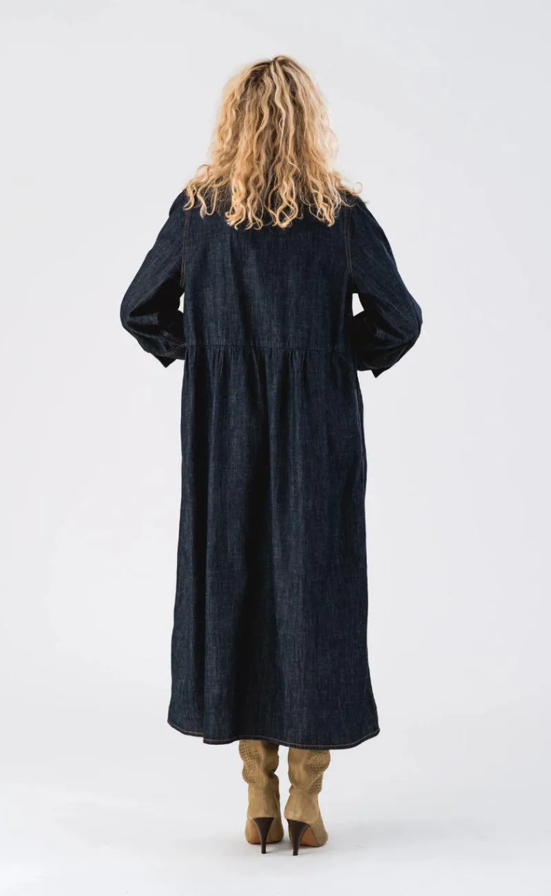 Denne smukke kjole er et tidløst valg til enhver garderobe, perfekt til dem, der værdsætter en klassisk mørk denimkjole med et moderne twist.