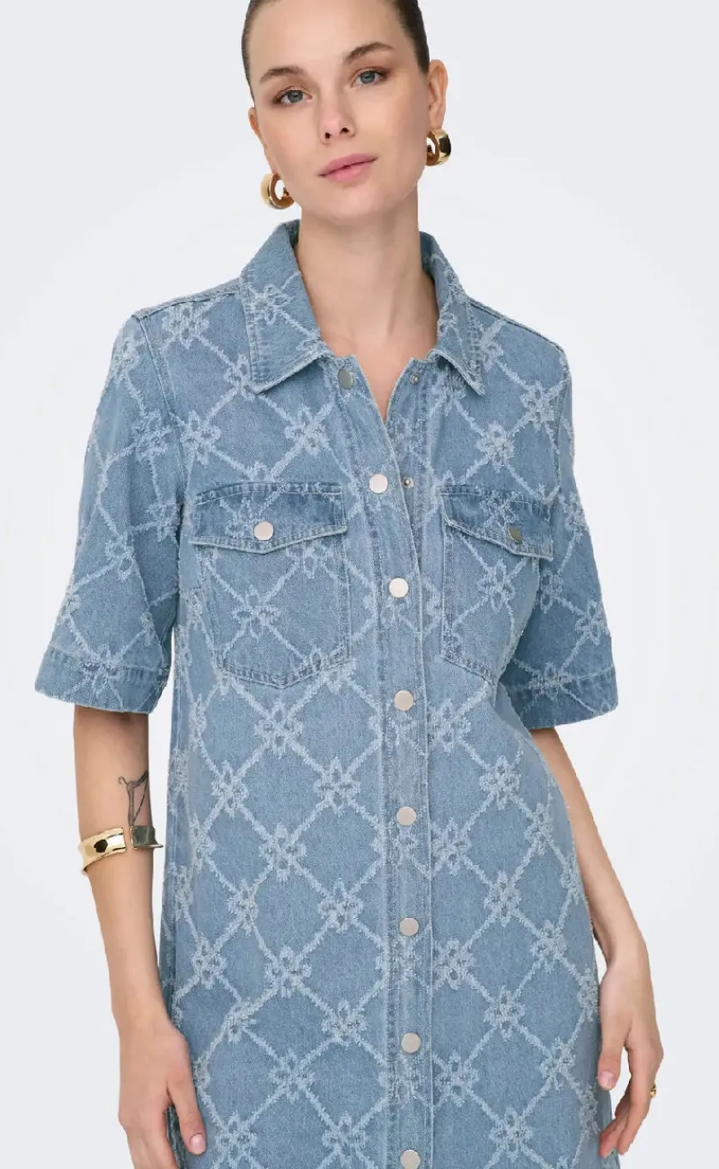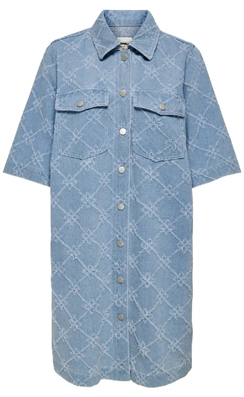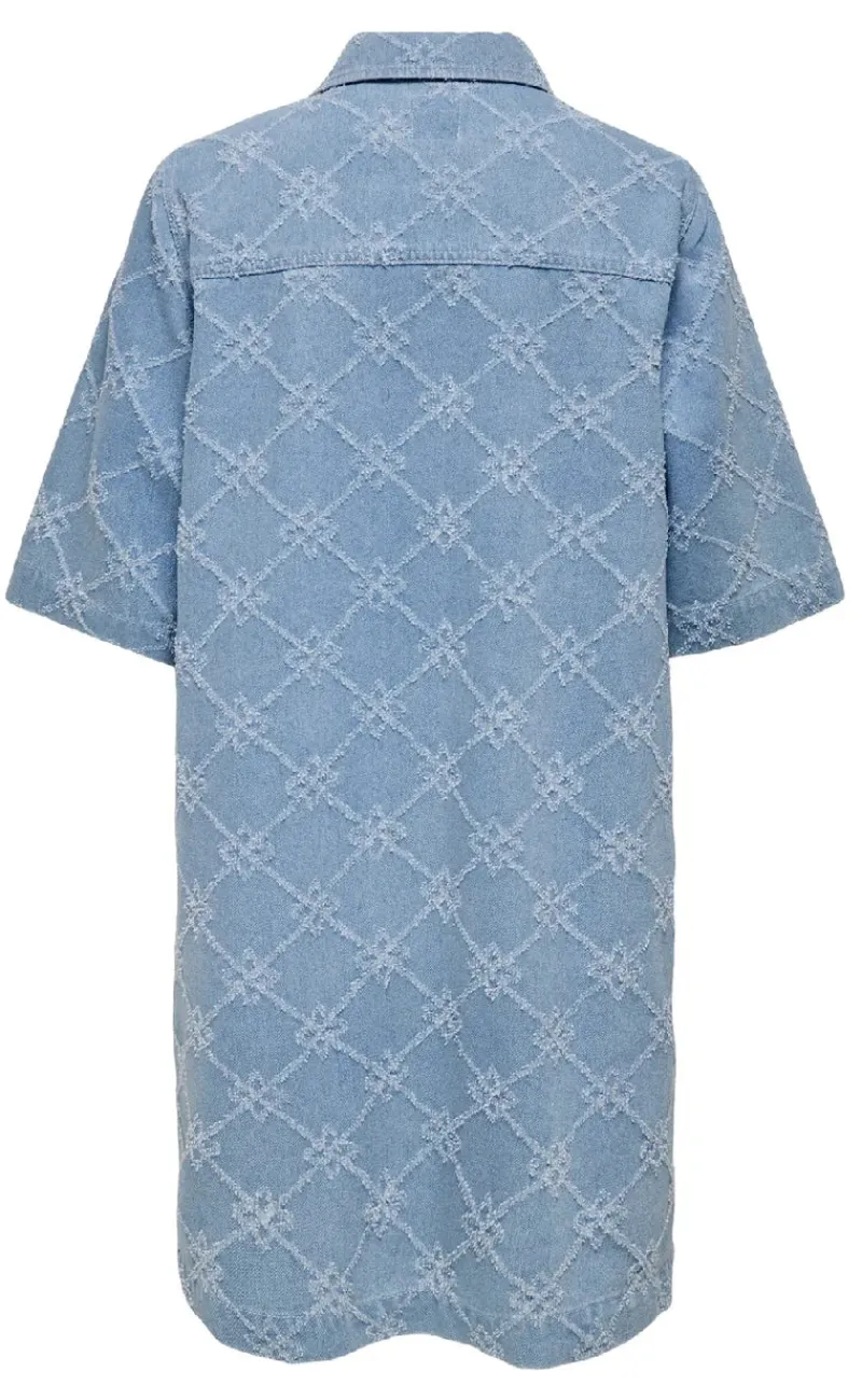 Flot kjole fra ONLY i en lyseblå denim, med et hvidt mønster.