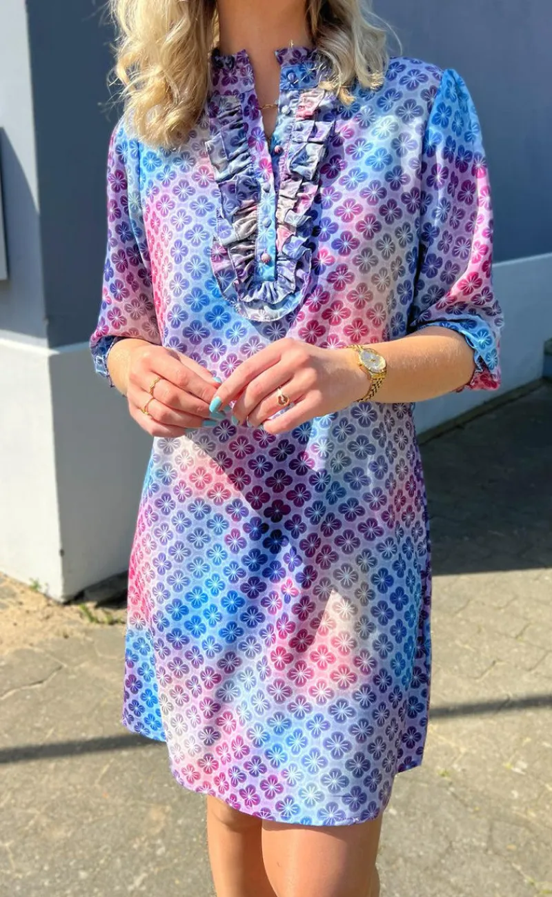 Smuk kjole fra INA Copenhagen med det fineste mønster og flæser fortil.