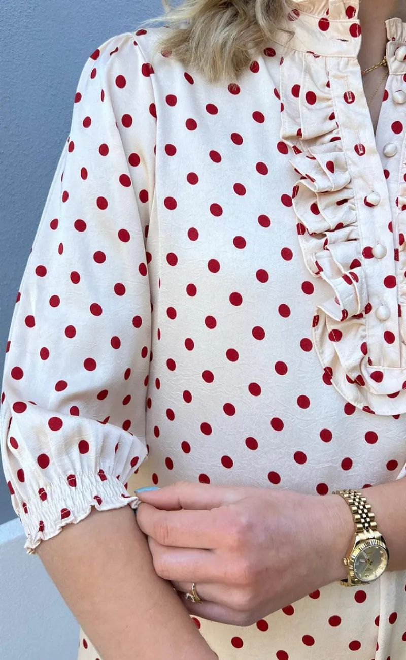 Smuk kjole fra INA Copenhagen med en beige baggrund og røde prikker. Kjolen har de fineste flæser fortil.